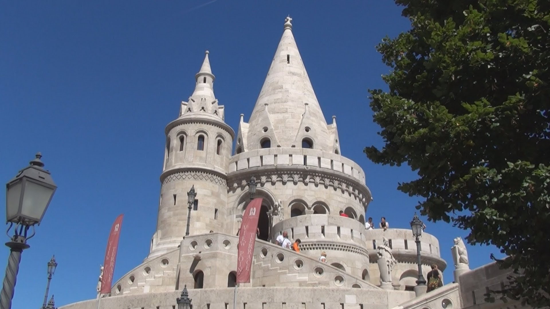 Description: A castle like structure with a clock on the front of it and a light pole in front of it.