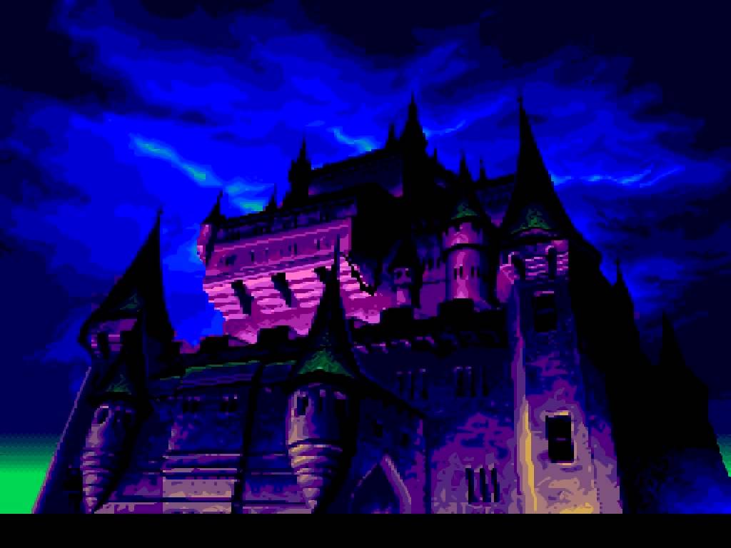 Description: A castle with a clock tower and a sky background with clouds and blue and green colors in the sky.