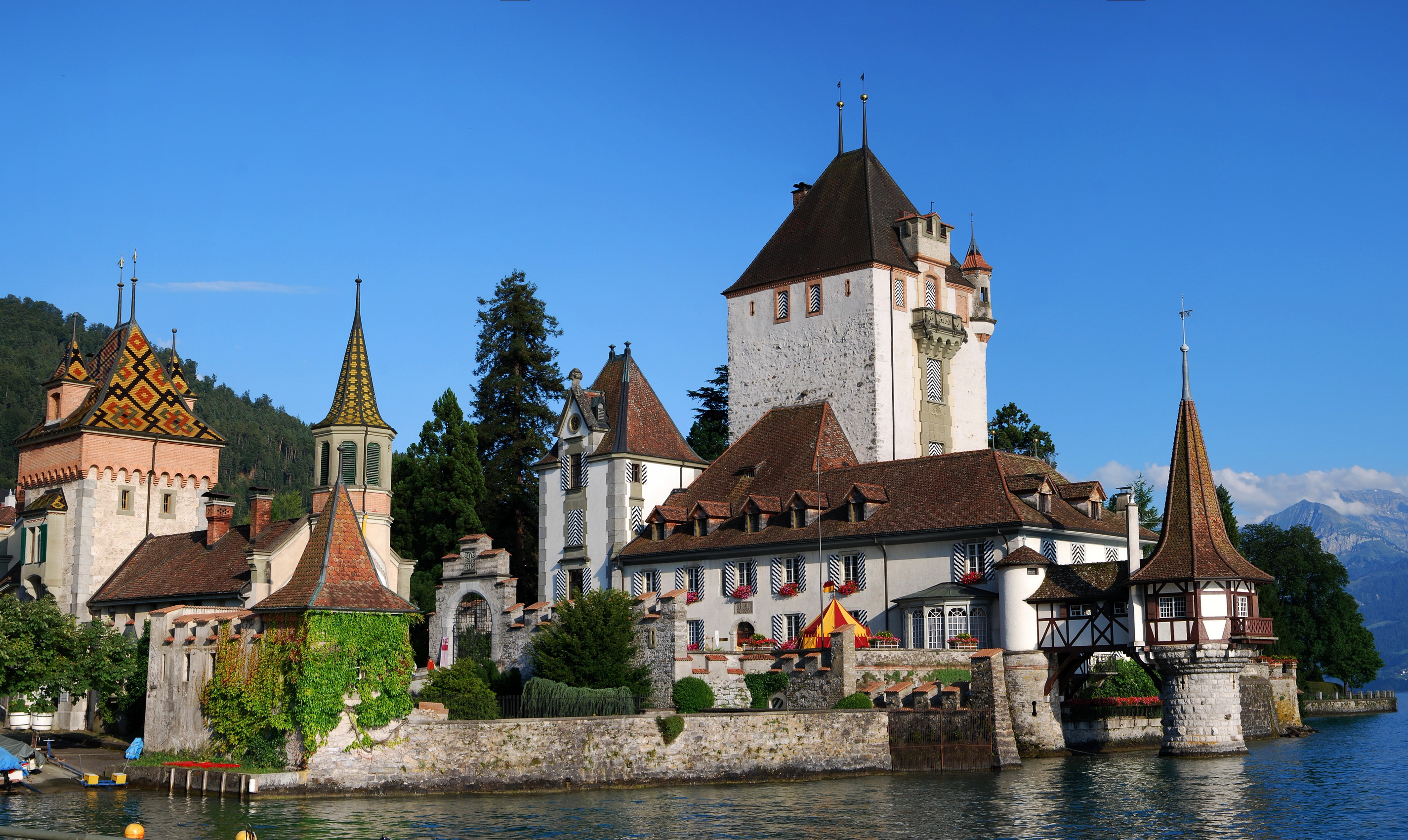 Description: A castle with a clock tower on the top of it next to a body of water with a bridge.