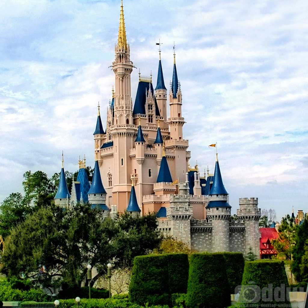 Description: A castle with a clock on the front of it and a lot of trees around it and a blue sky.
