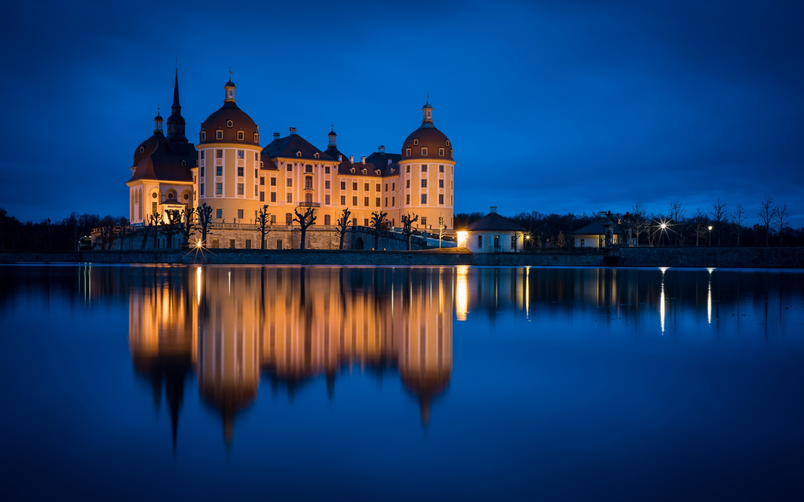 Description: A large building with a clock tower on top of it's side next to a body of water.