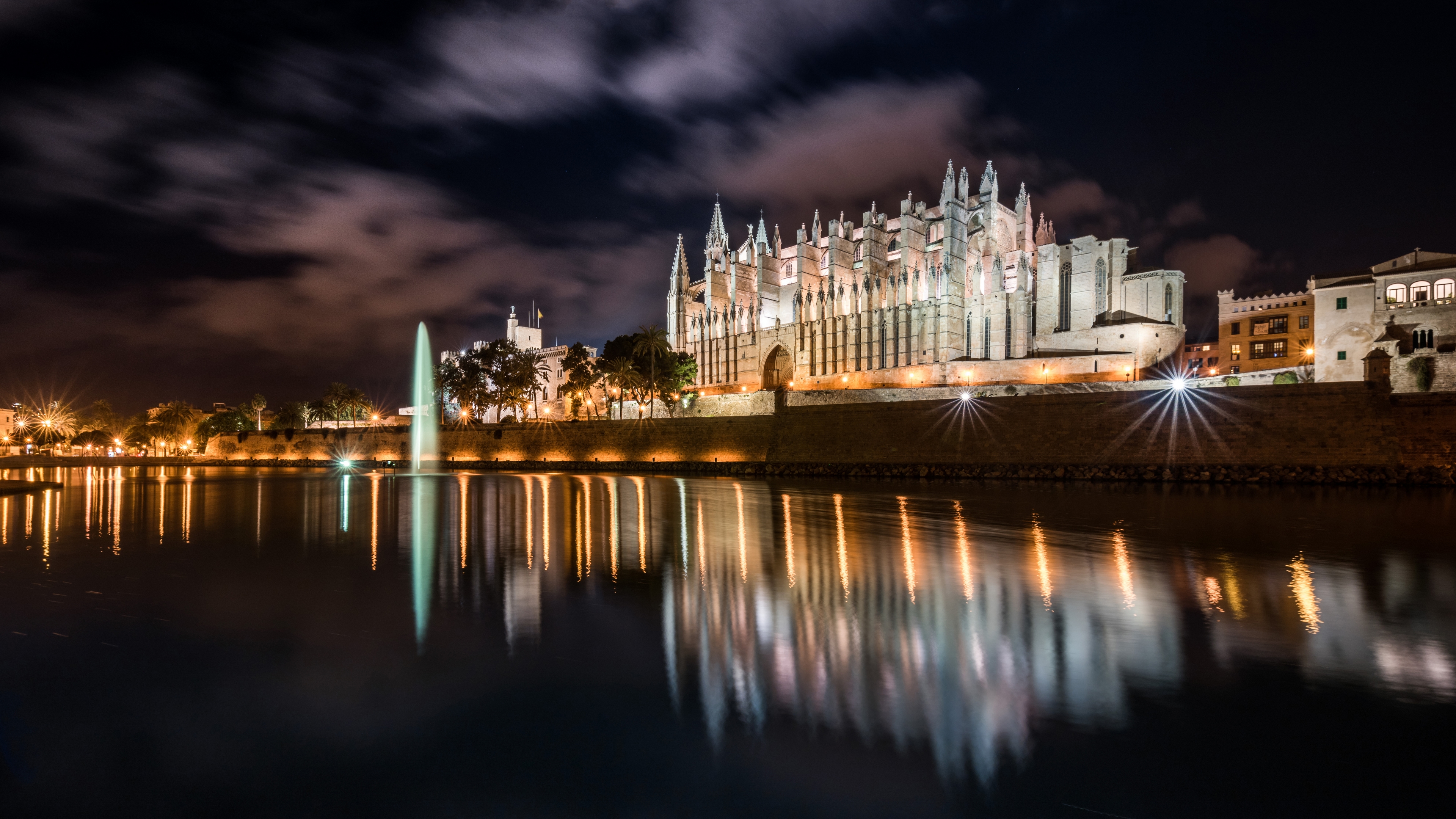 Description: A castle lit up at night with a fountain in front of it and a cloudy sky above it and reflecting in the water.