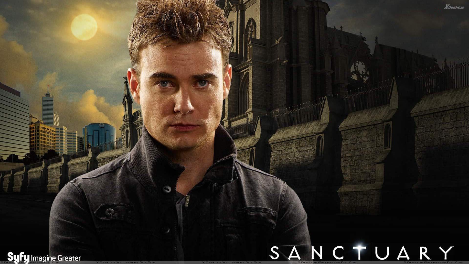 Description: A man with a black jacket and a black shirt is standing in front of a castle with a full moon in the background.