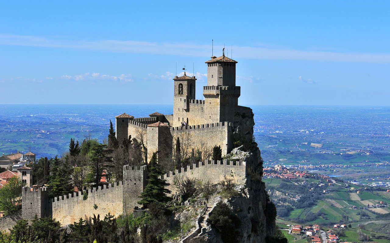 Description: A castle on a hill with a view of the city below it and a blue sky above it.