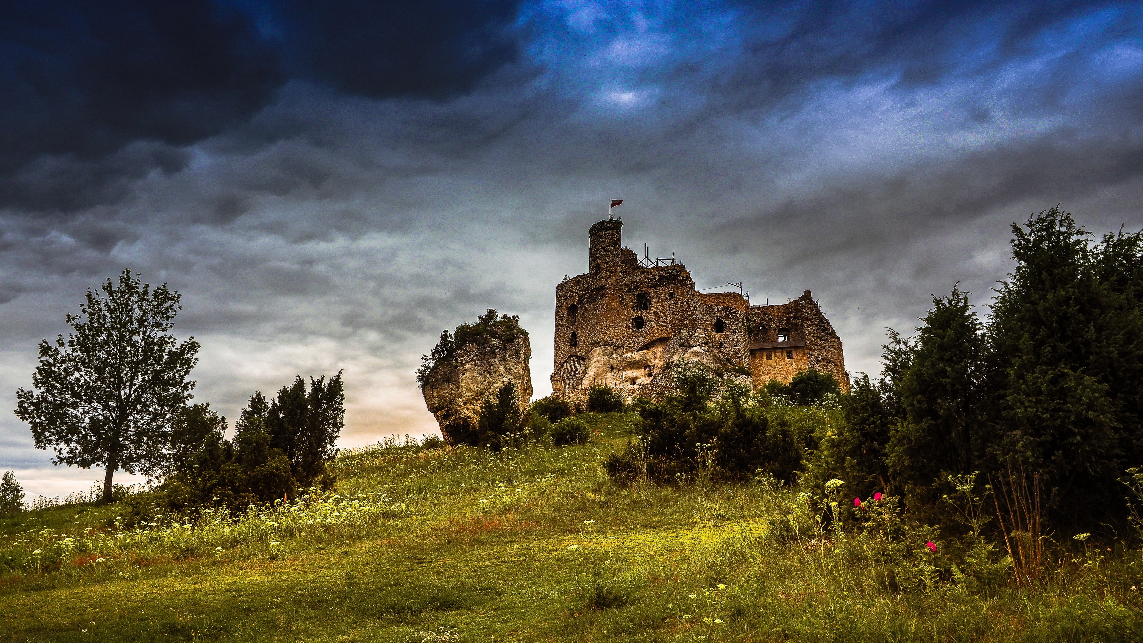 Description: A castle on a hill with a cloudy sky above it and trees below it.