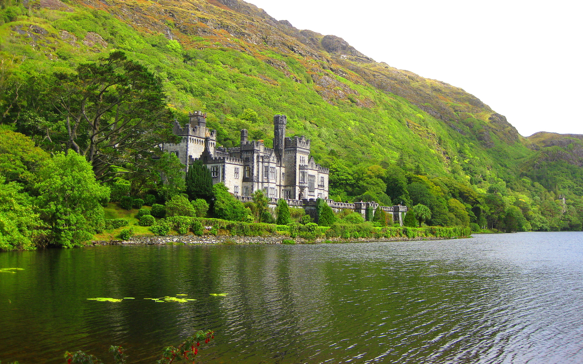 Description: A castle on a hill next to a lake with a lily pad in the foreground and a green hillside in the background.