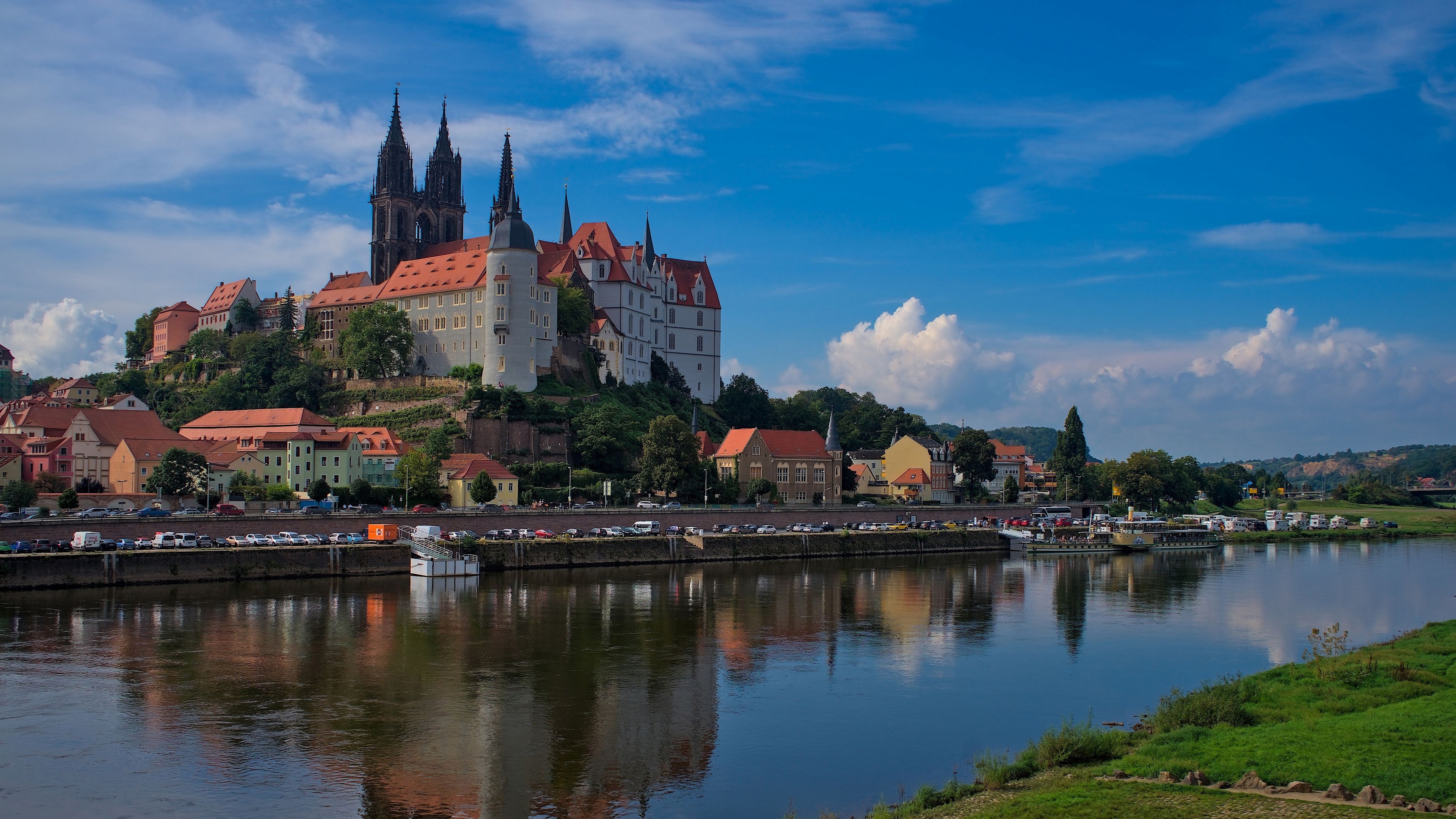 Description: A castle on a hill with a river running through it and a town on the other side of the river.