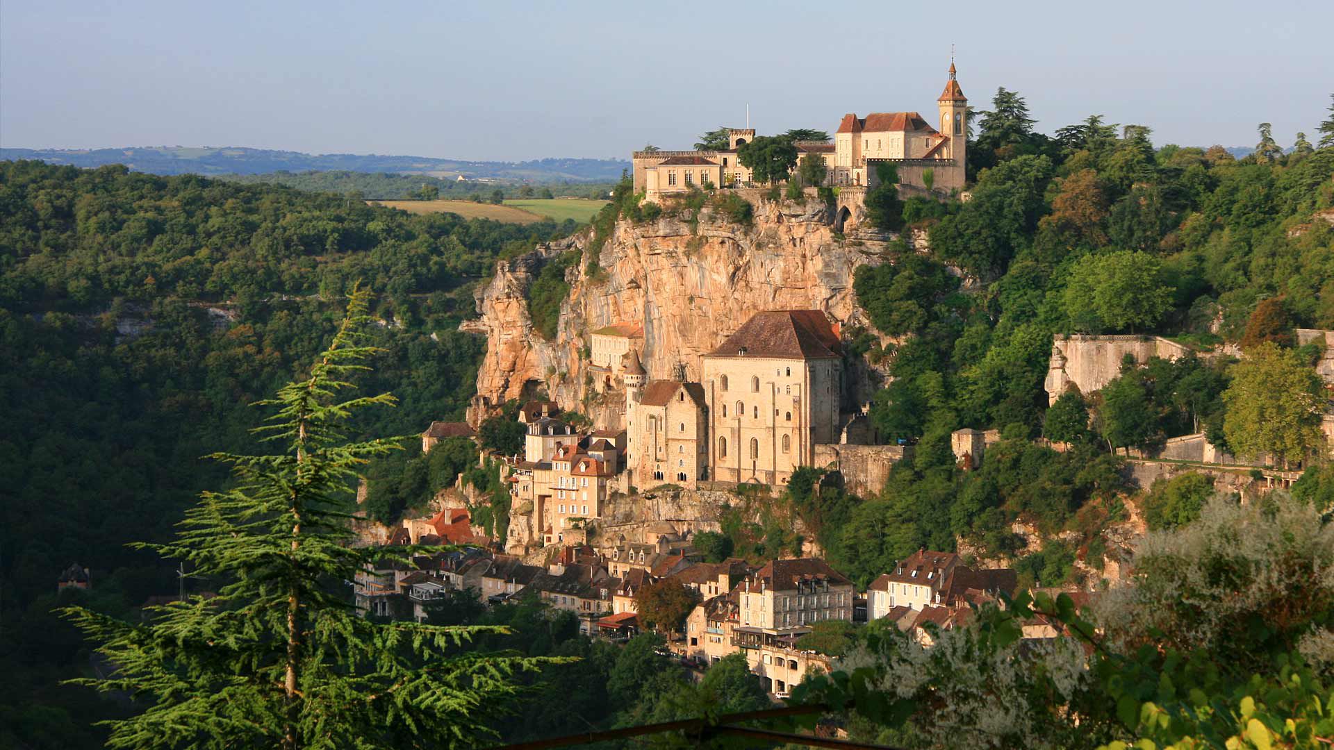 Description: A castle on a hill with trees surrounding it and a blue sky above it and a few buildings on the top of the hill.