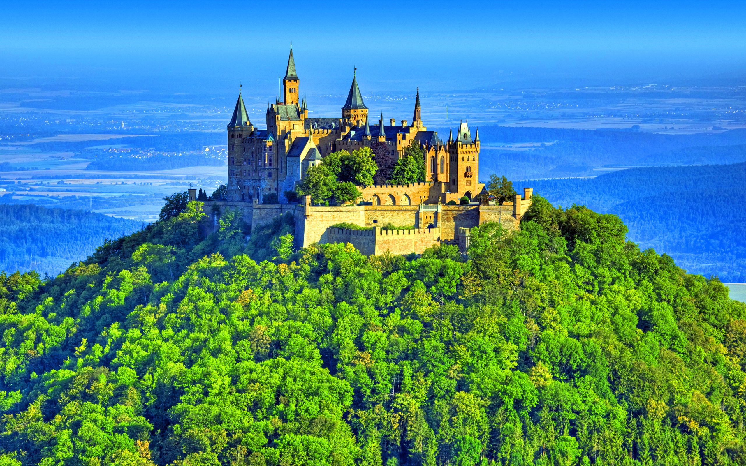 Description: A castle on a hill with trees on it's side and a blue sky in the background with a few clouds.