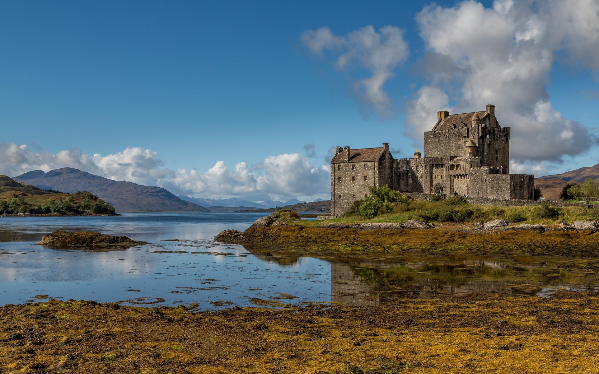 Description: A castle sitting on top of a lush green field next to a lake and mountains in the background with clouds.