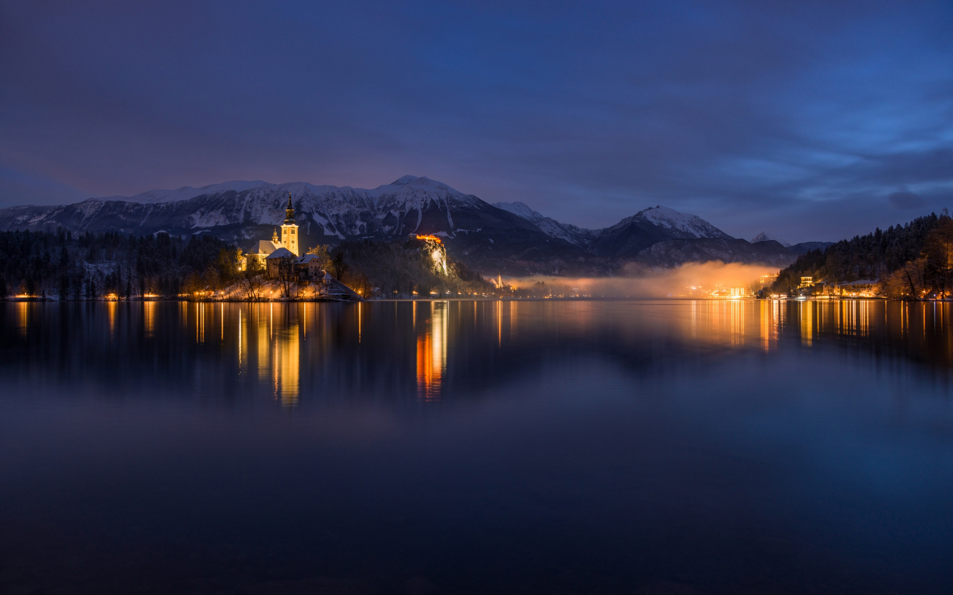 Description: A lake with a castle in the middle of it and mountains in the background at night time with fog.
