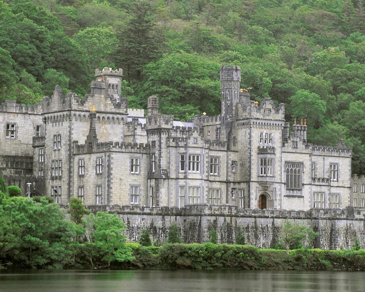 Description: A castle with a lake in front of it and trees in the background on a hill side with a forest.
