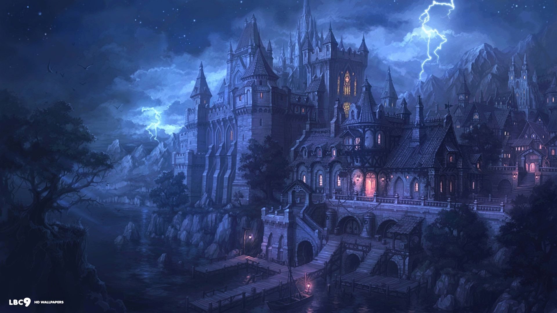 Description: A castle with a lightning bolt in the sky above it and a tree in the foreground with a lightning bolt in the sky above it.