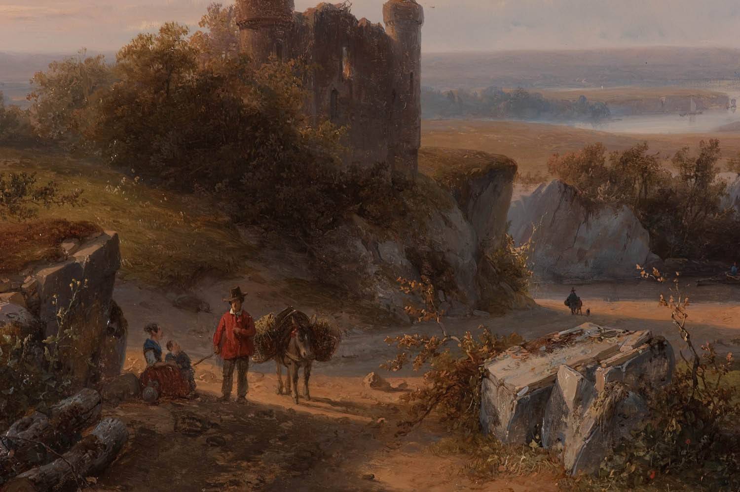 Description: A painting of a castle with a man on a horse and a woman on a horse and a man on a horse.