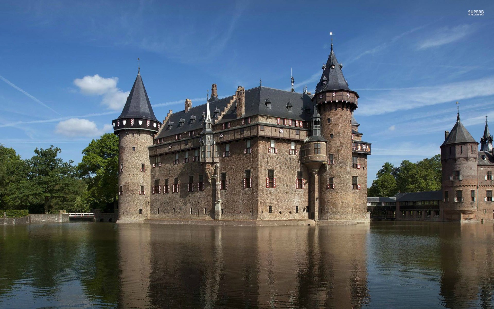 Description: A castle with a moat and towers on a lake with trees in the background and a blue sky with clouds.