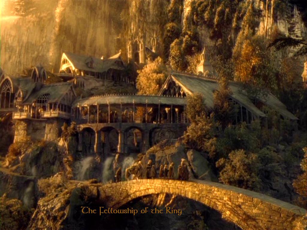 Description: A painting of a castle on a mountain with a bridge and waterfall in the background with a sunbeam.