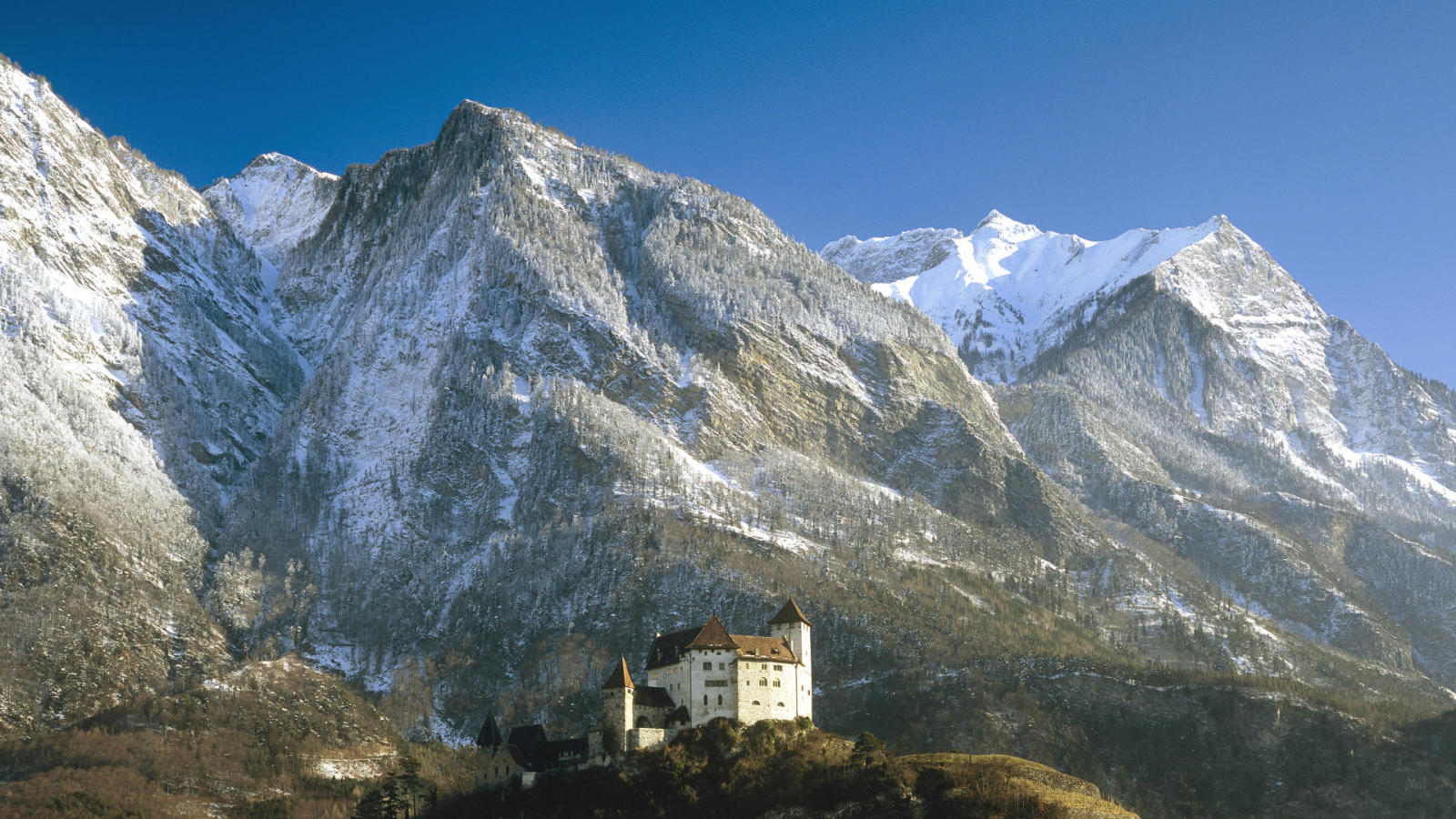 Description: A castle on a mountain with a mountain range in the background and a blue sky in the foreground.
