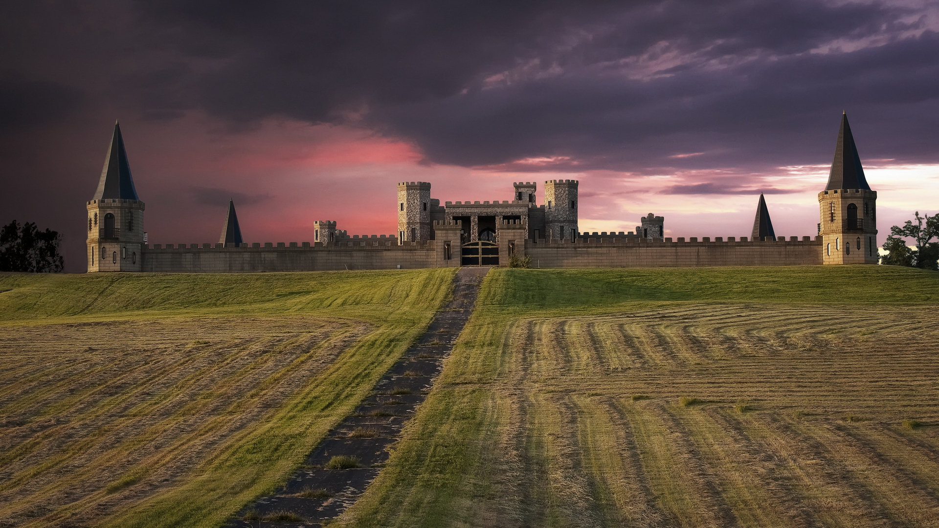 Description: A castle with a path leading to it and a sunset in the background with clouds in the sky above.