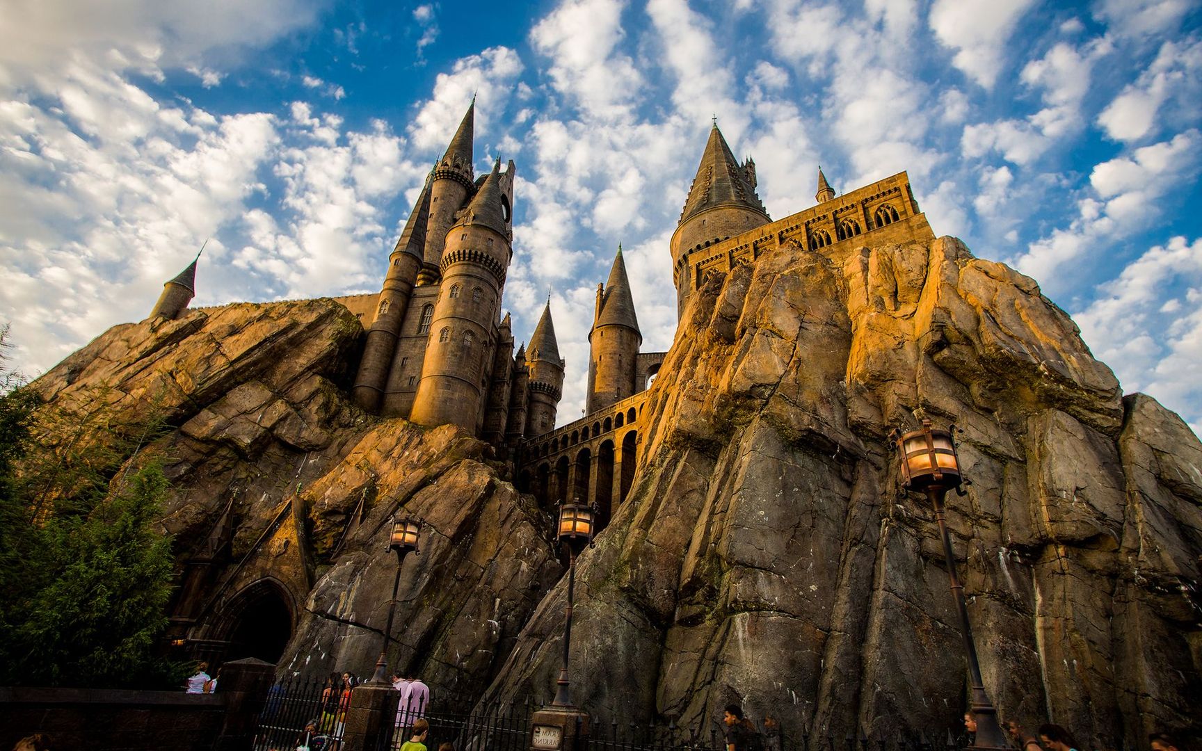 Description: A castle with a lot of people standing around it and a sky background with clouds in the background and a few people standing around it.