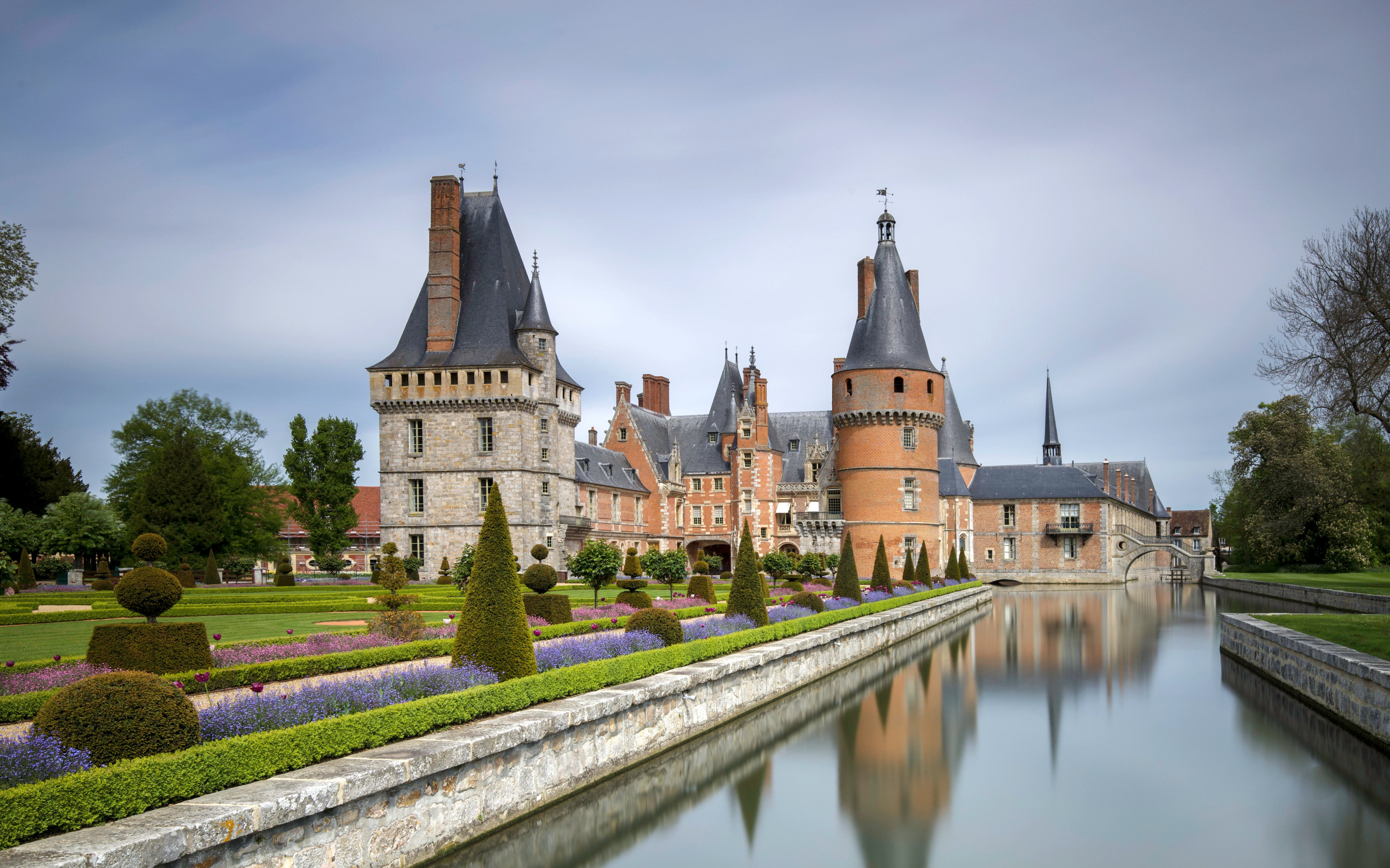 Description: A castle with a pond in front of it and a garden in front of it with flowers and trees.