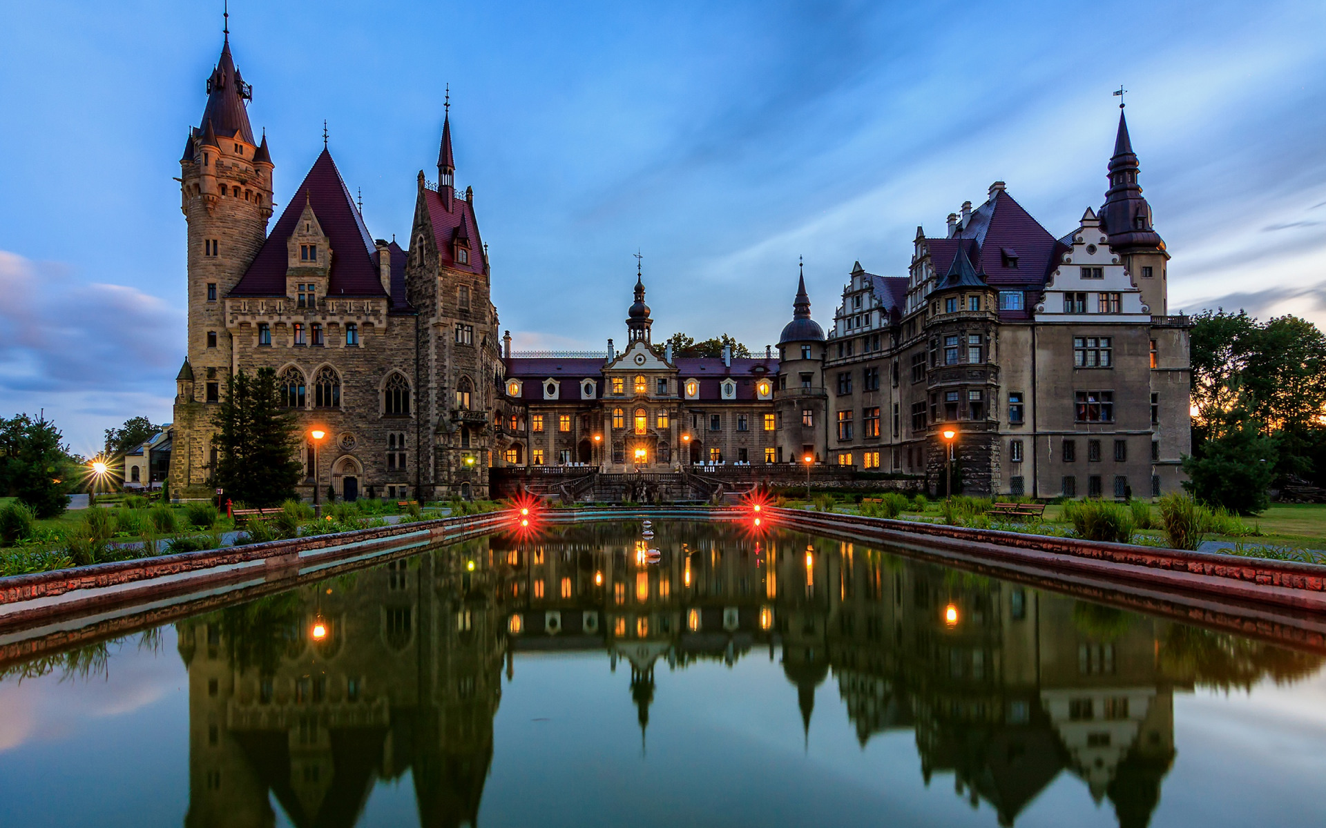 Description: A castle with a pond in front of it at night time with lights on the windows and a clock tower.