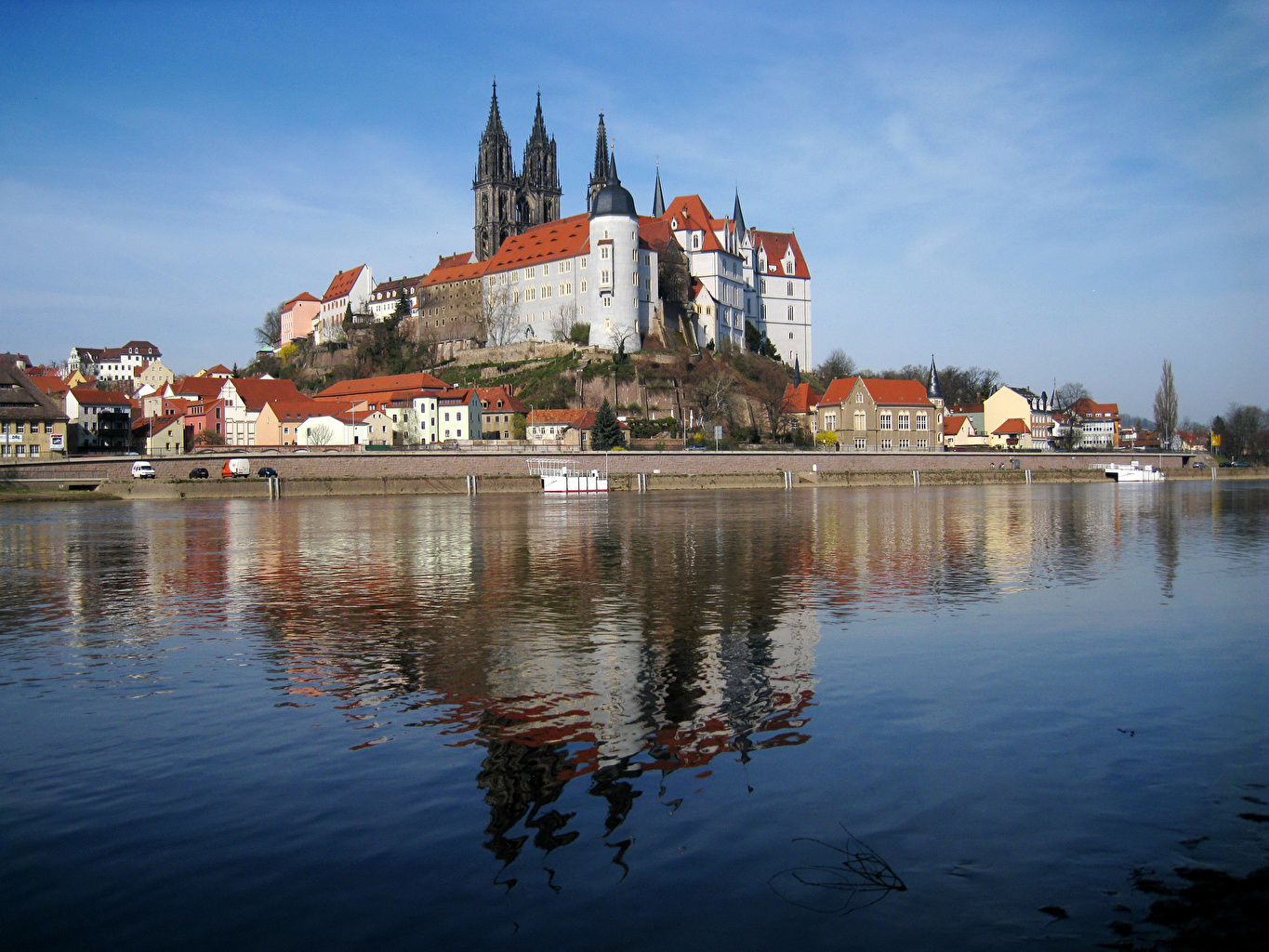 Description: A castle with a red roof is reflected in the water of a lake in front of a city with a castle on top.