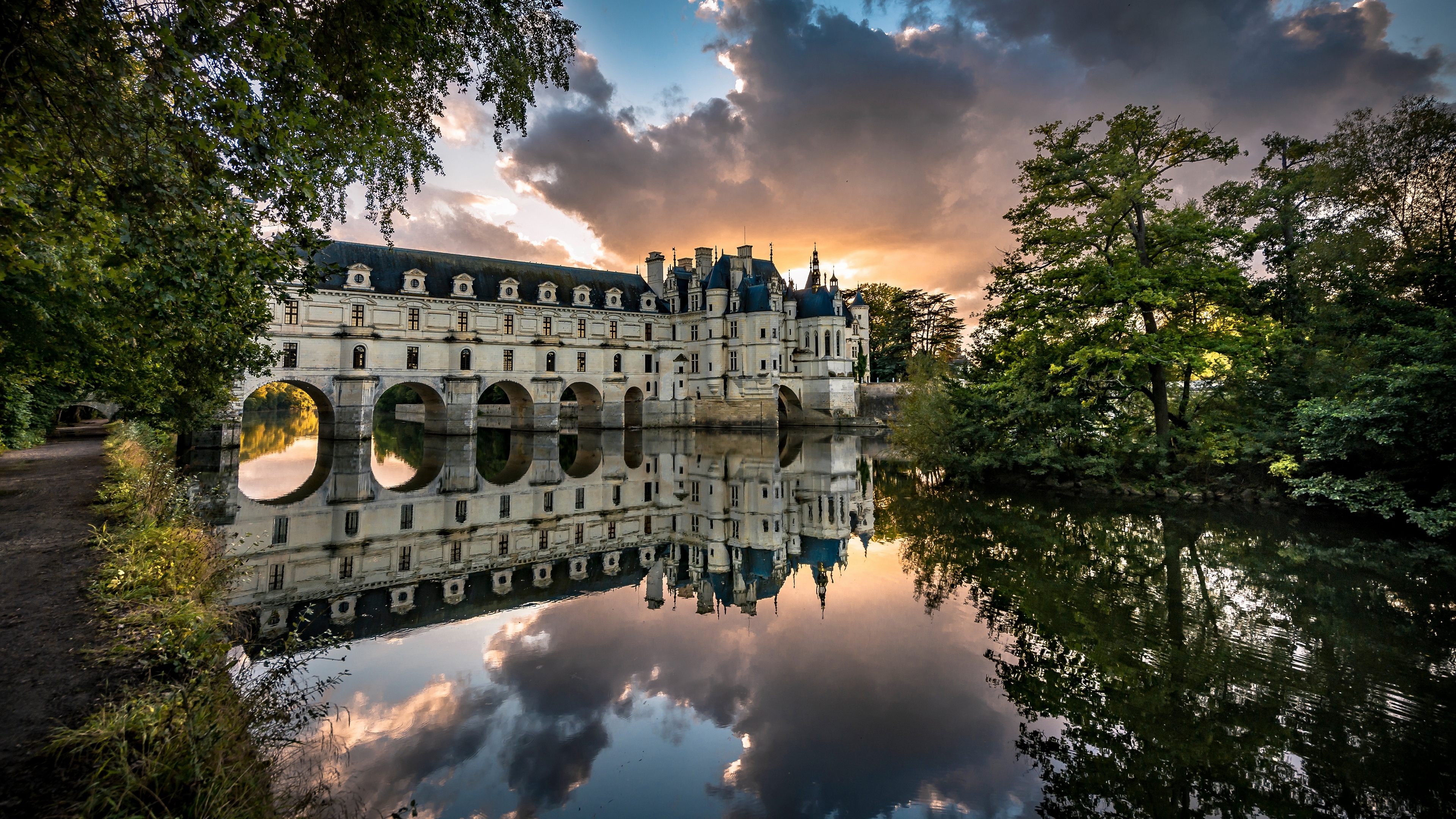 Description: A castle with a reflection in the water at sunset or dawn with clouds in the sky and trees surrounding it.