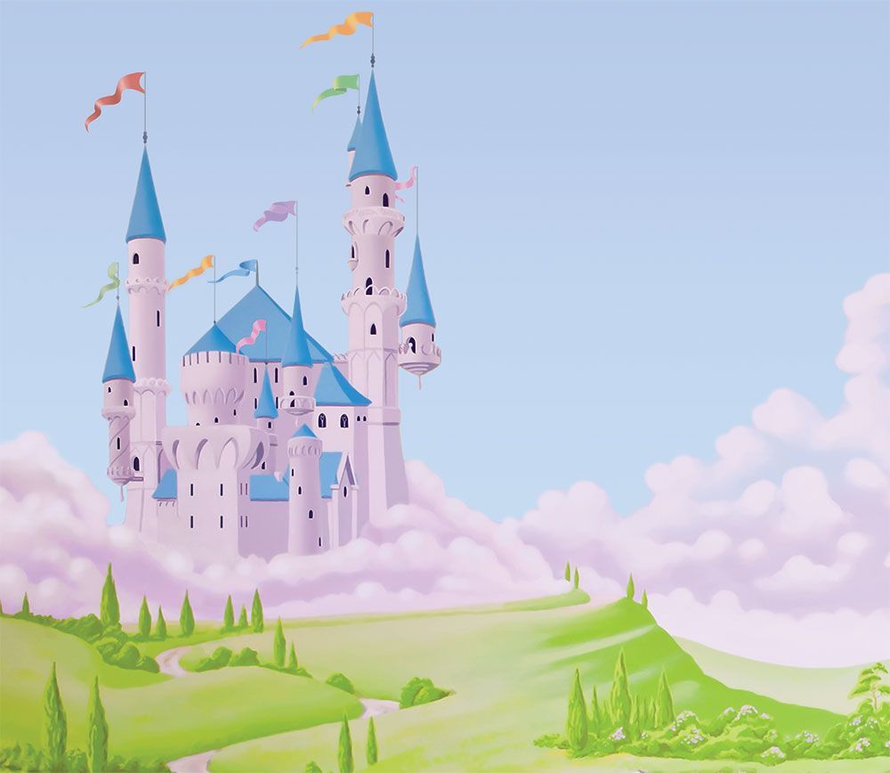 Description: A painting of a castle in the sky with a lot of clouds in the background and a few birds flying around.