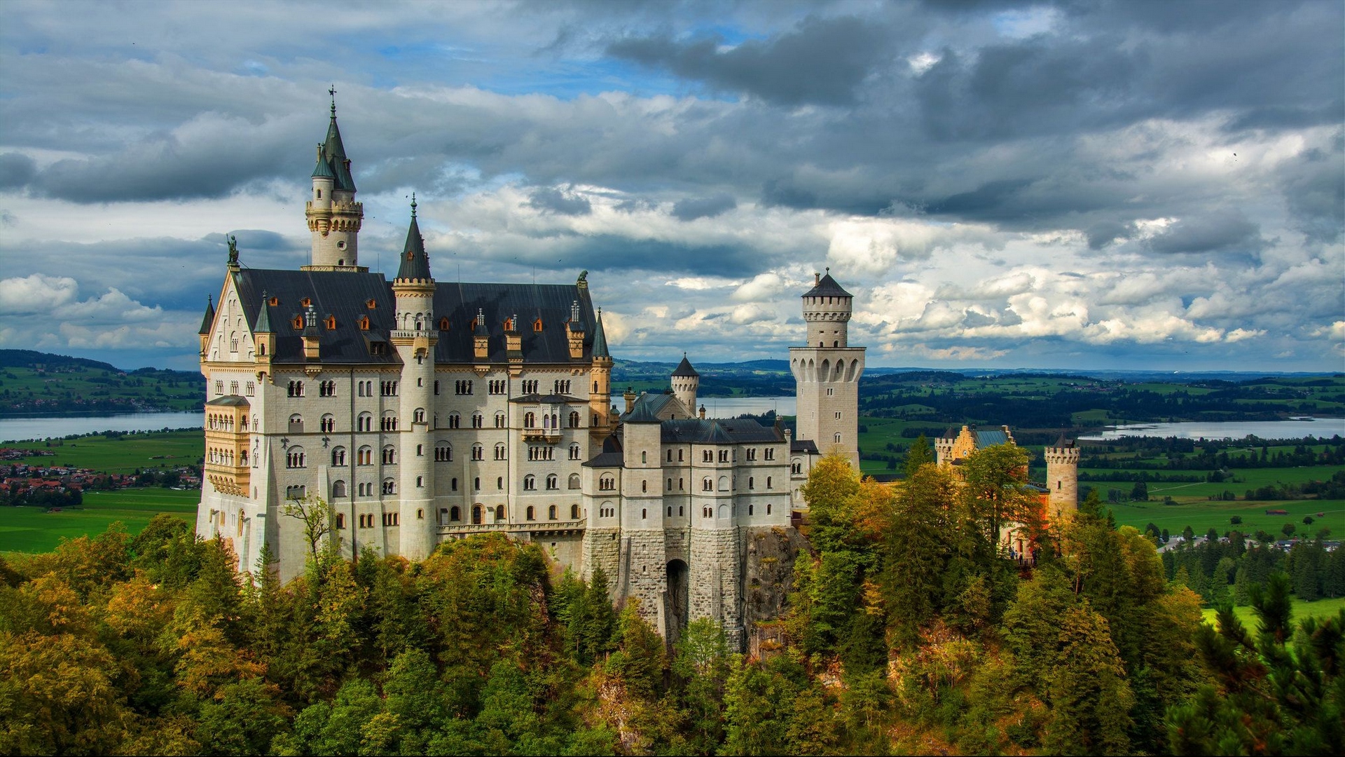 Description: A castle with a tower and a clock on it's side surrounded by trees and a lake in the background.