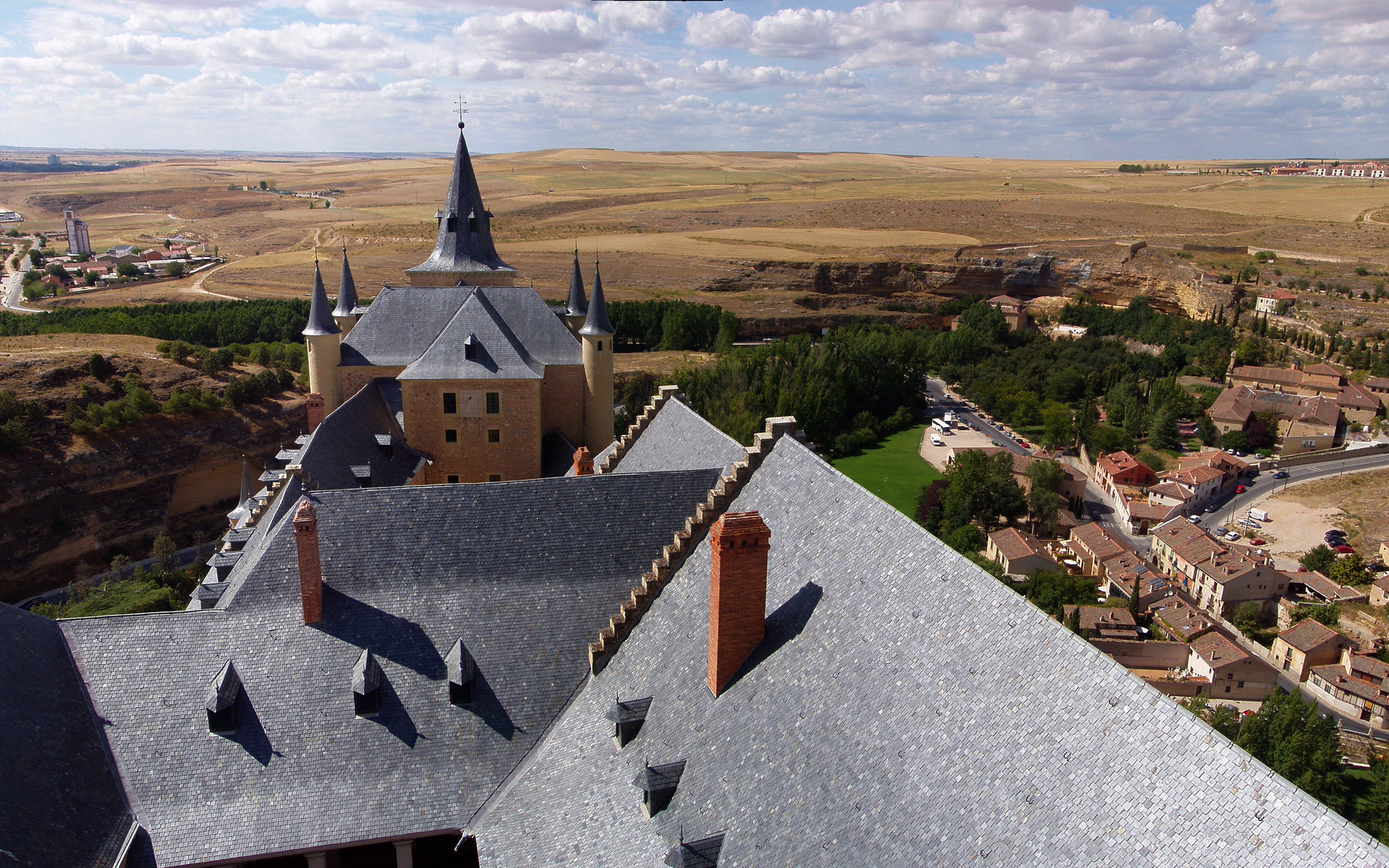 Description: A castle with a tower and a clock on it's side in a rural area with a river running through it.