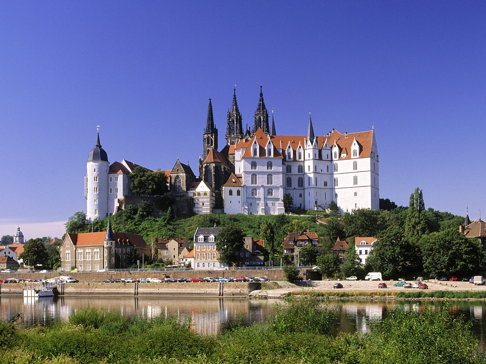 Description: A castle with a large tower on top of it next to a river and trees in front of it.