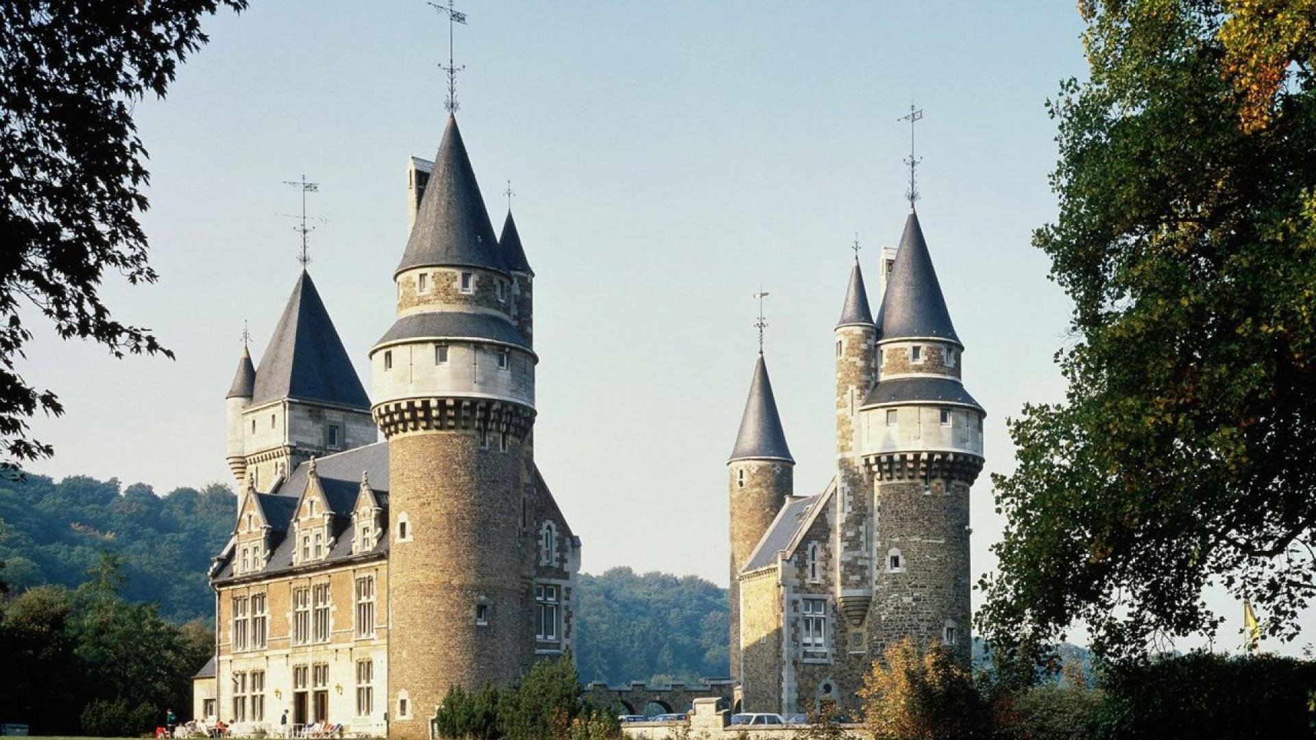 Description: A castle with turrets and towers in a park area with trees and grass in front of it and a blue sky.