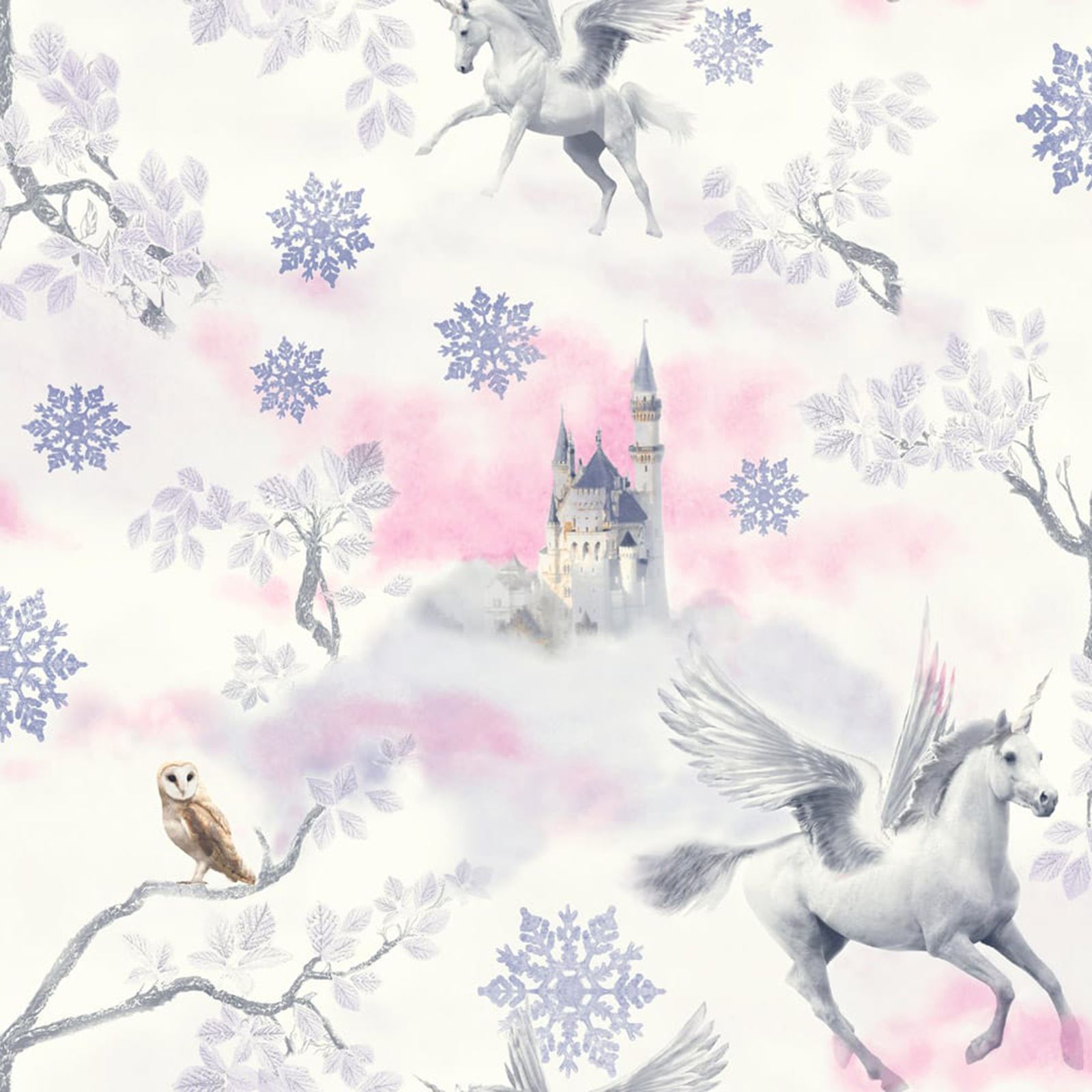Description: A wallpaper with a castle and unicorns on it and a bird on the branch in front of it.