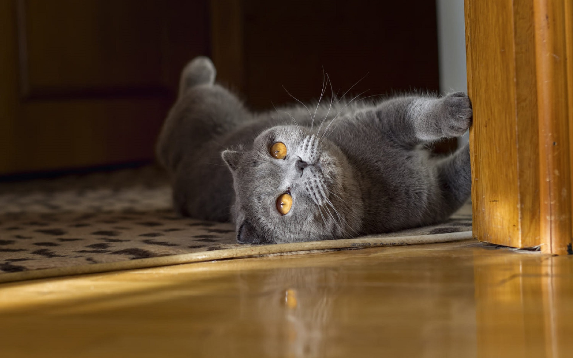 Description: A cat laying on its back on a rug on the floor next to a door and a wooden door.