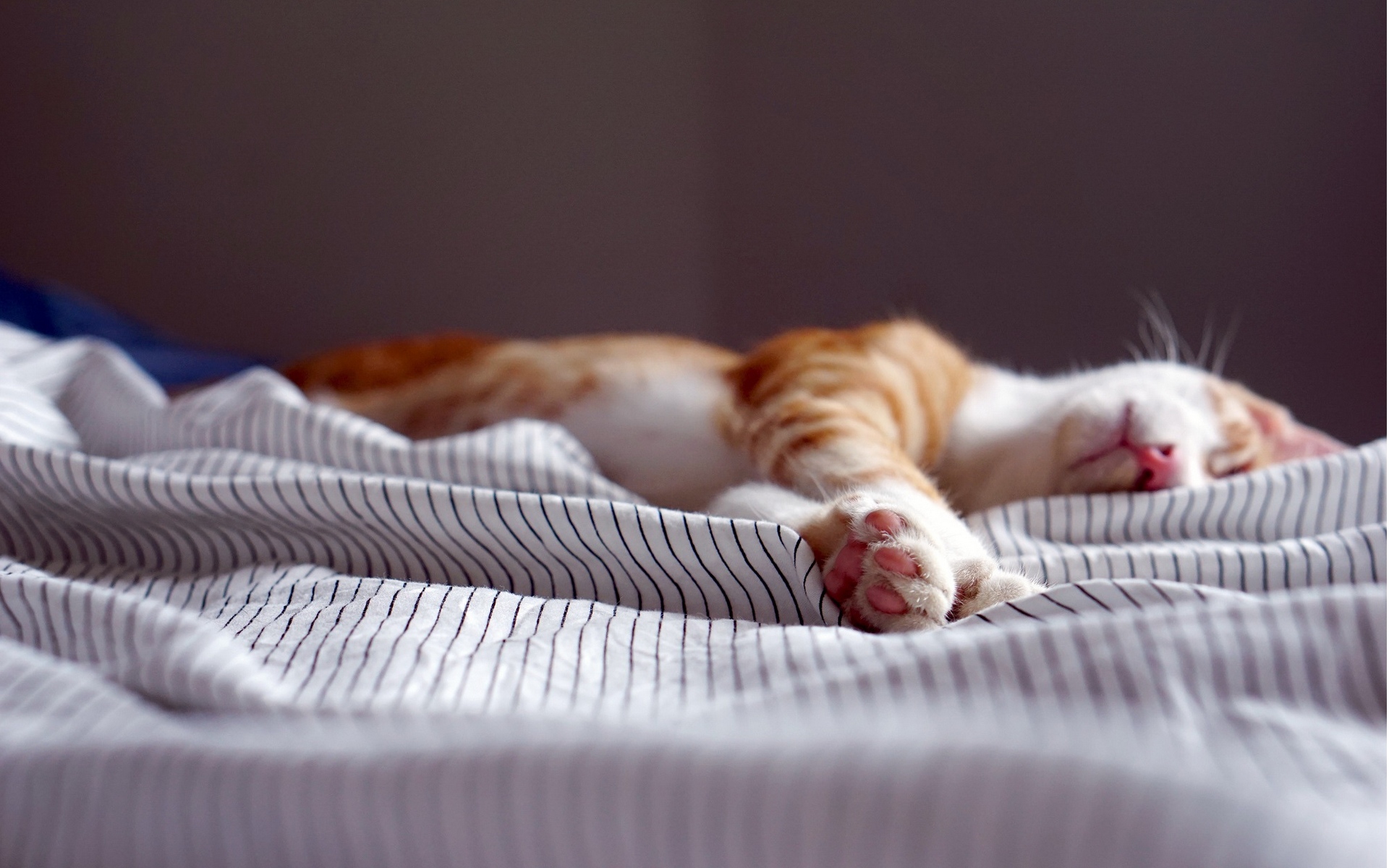 Description: A cat laying on a bed with a white and black blanket on it's side and paw on the bed.