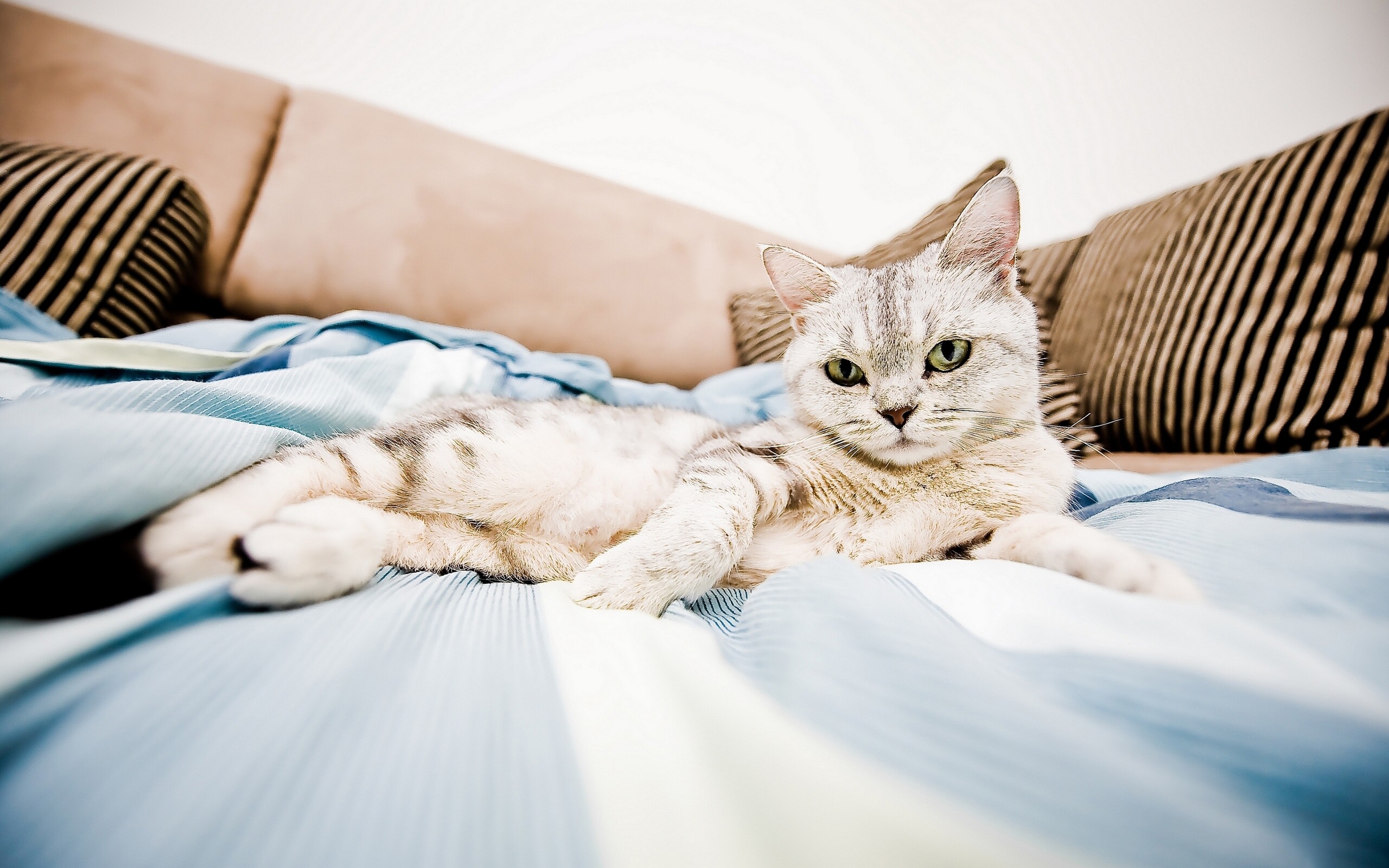 Description: A cat laying on a bed with a blue blanket and pillows on it's side and a pillow behind it.