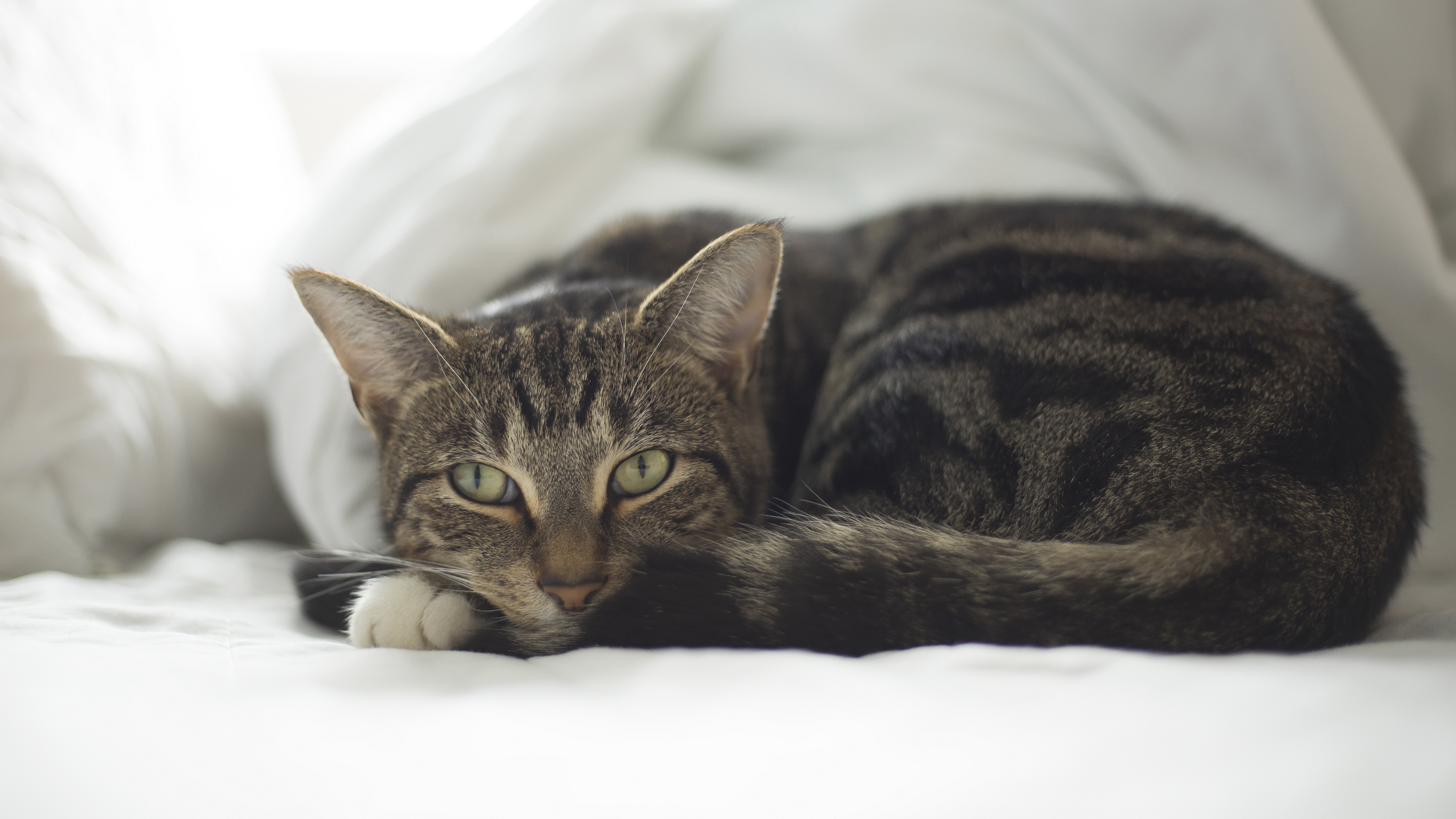 Description: A cat laying on a bed with white sheets and pillows in the background.