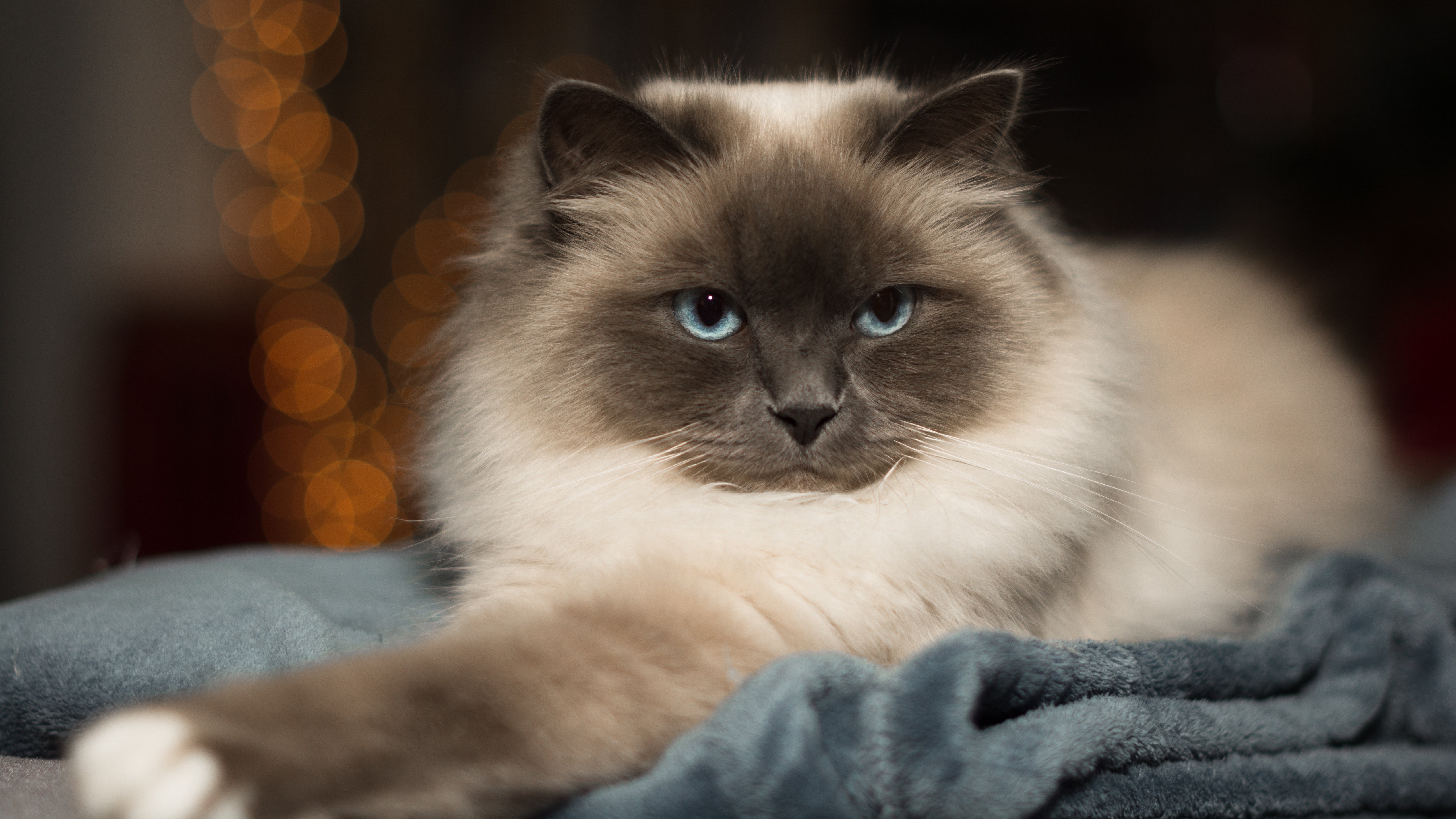 Description: A cat laying on a blanket with a blurry background of lights in the background and a blurry background.