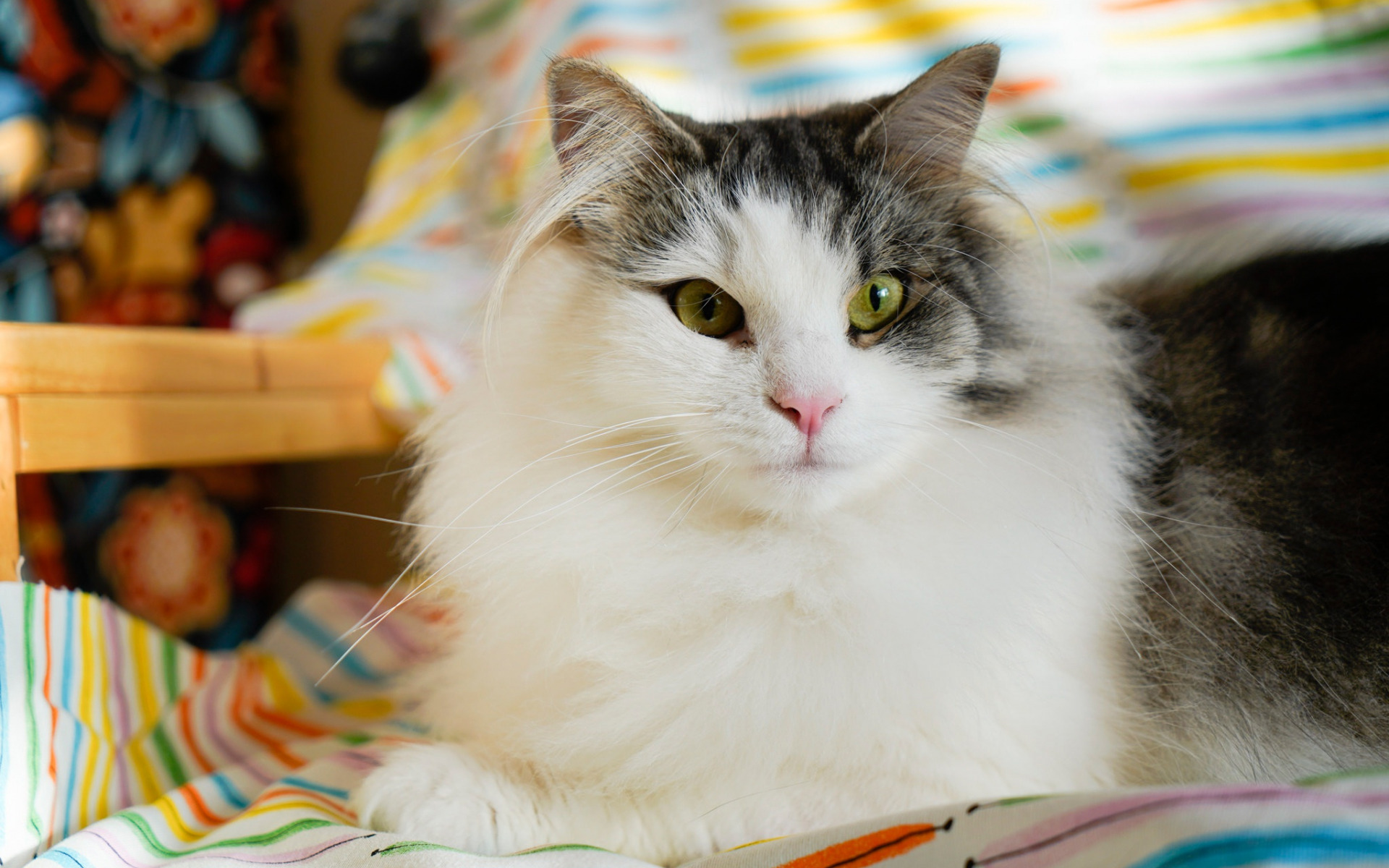 Description: A cat sitting on a blanket on a chair with a stuffed animal in the background and a stuffed animal on the floor.