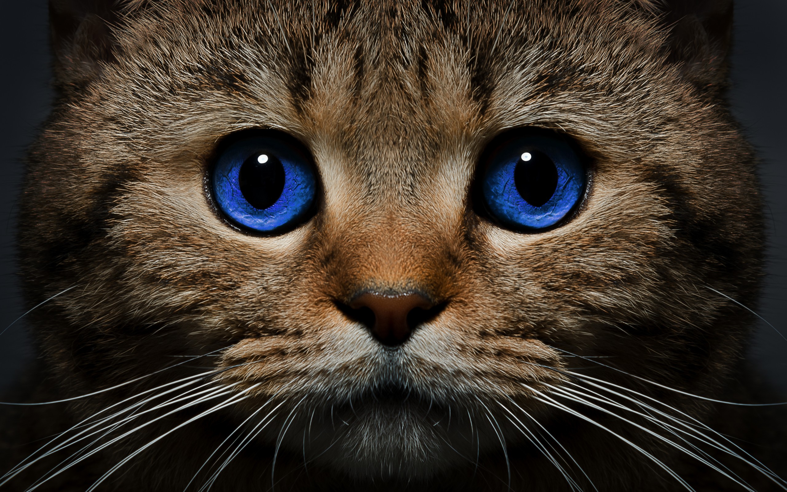Description: A cat with blue eyes looking at the camera with a black background and a black background with a cat's face.
