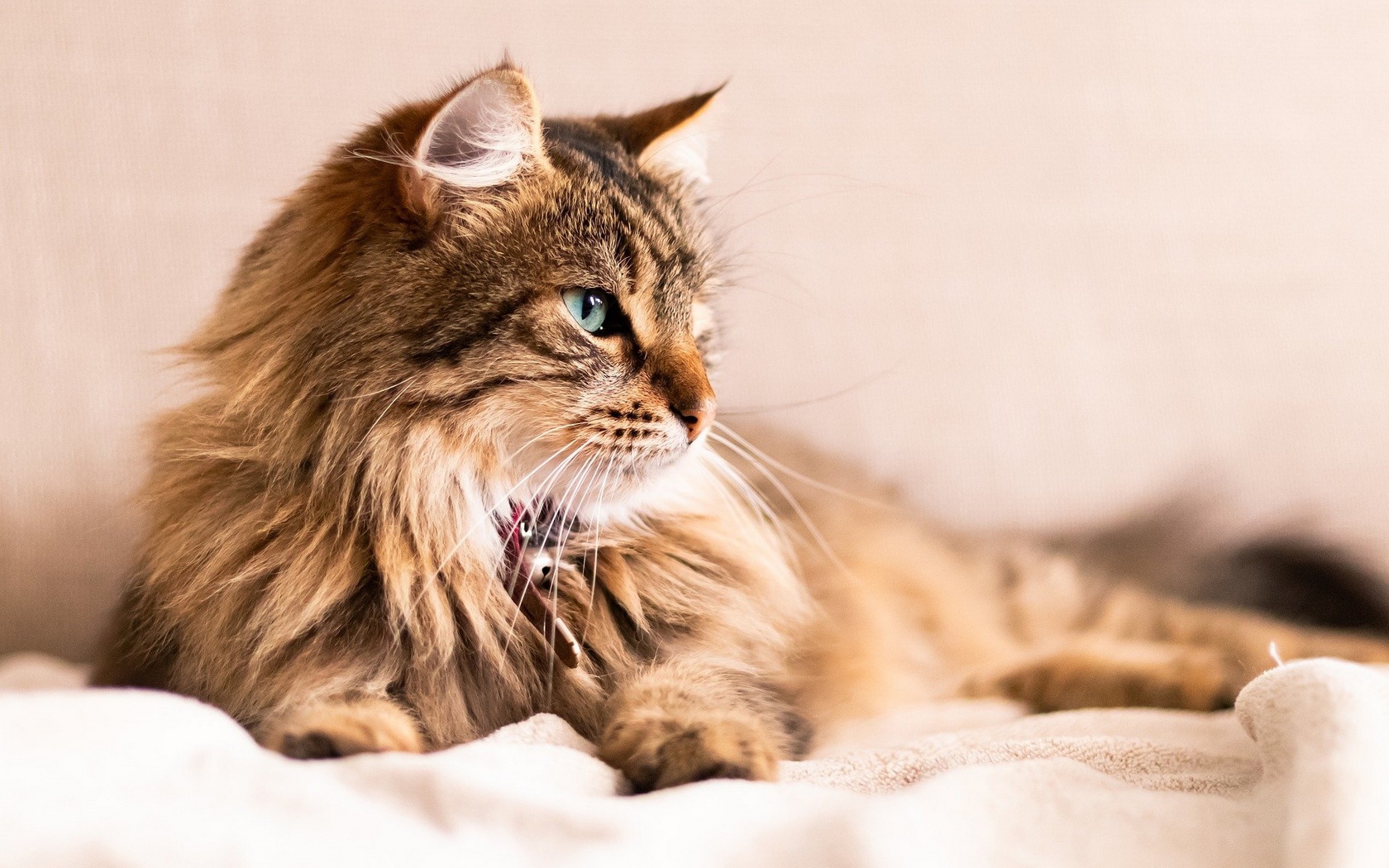 Description: A cat with blue eyes laying on a bed looking at something in the distance with a white blanket on it.