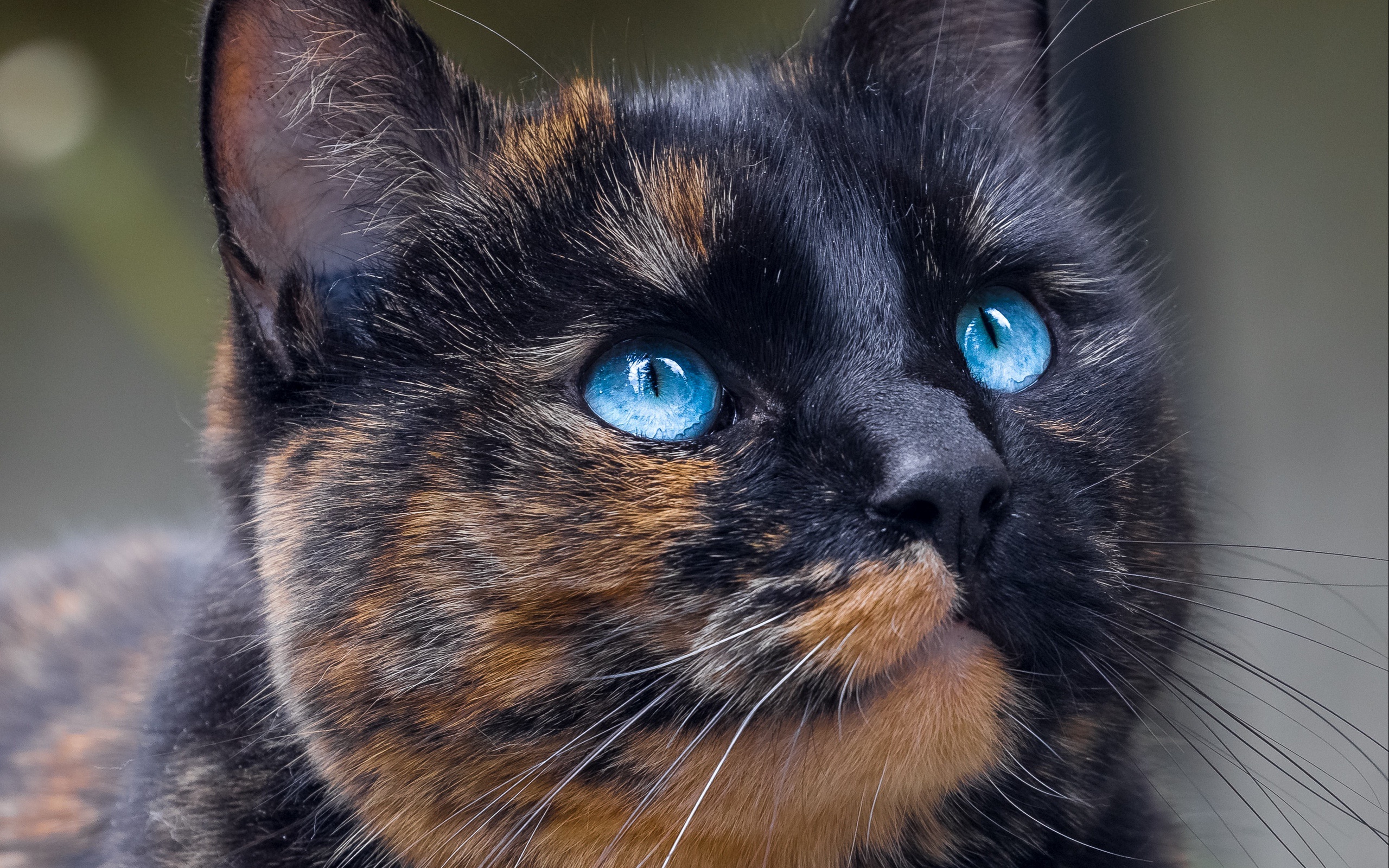 Description: A cat with blue eyes looking up at something in the distance with a blurry background of trees and bushes.