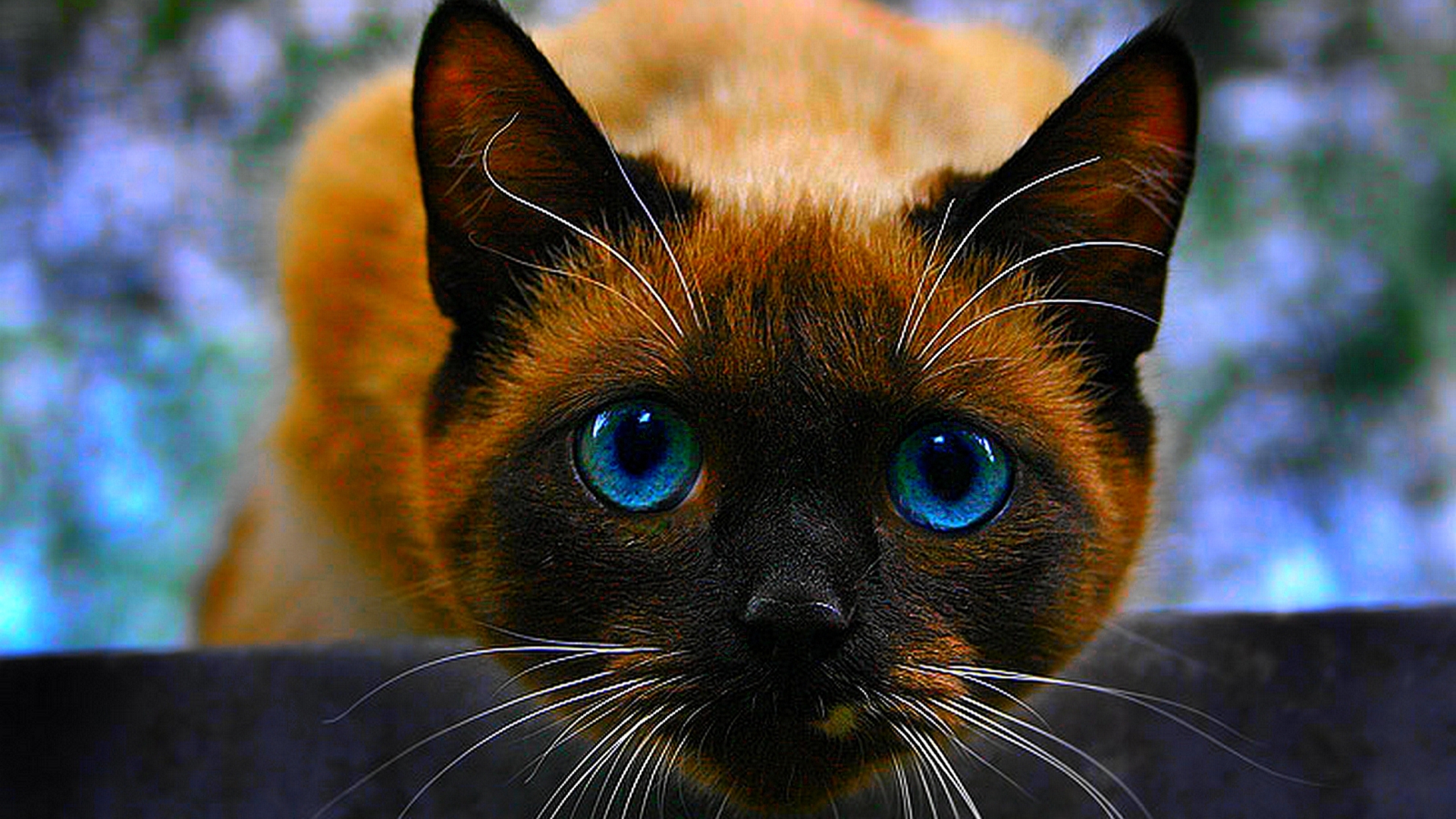 Description: A cat with blue eyes looking at the camera with a blurry background of trees in the background and a blurry background of leaves.