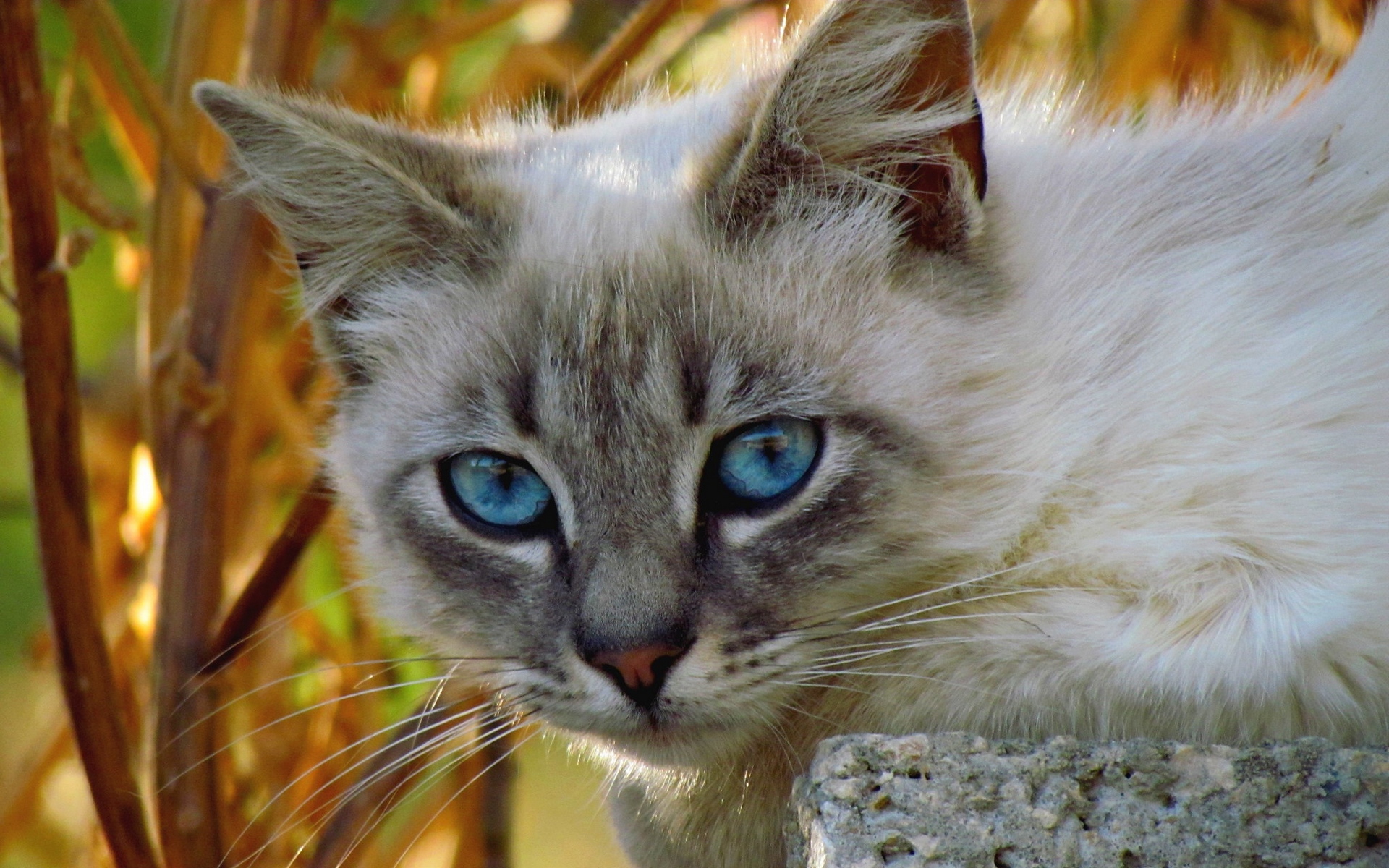 Description: A cat with blue eyes sitting on a rock outside in the sun with a bush behind it and a tree behind it.