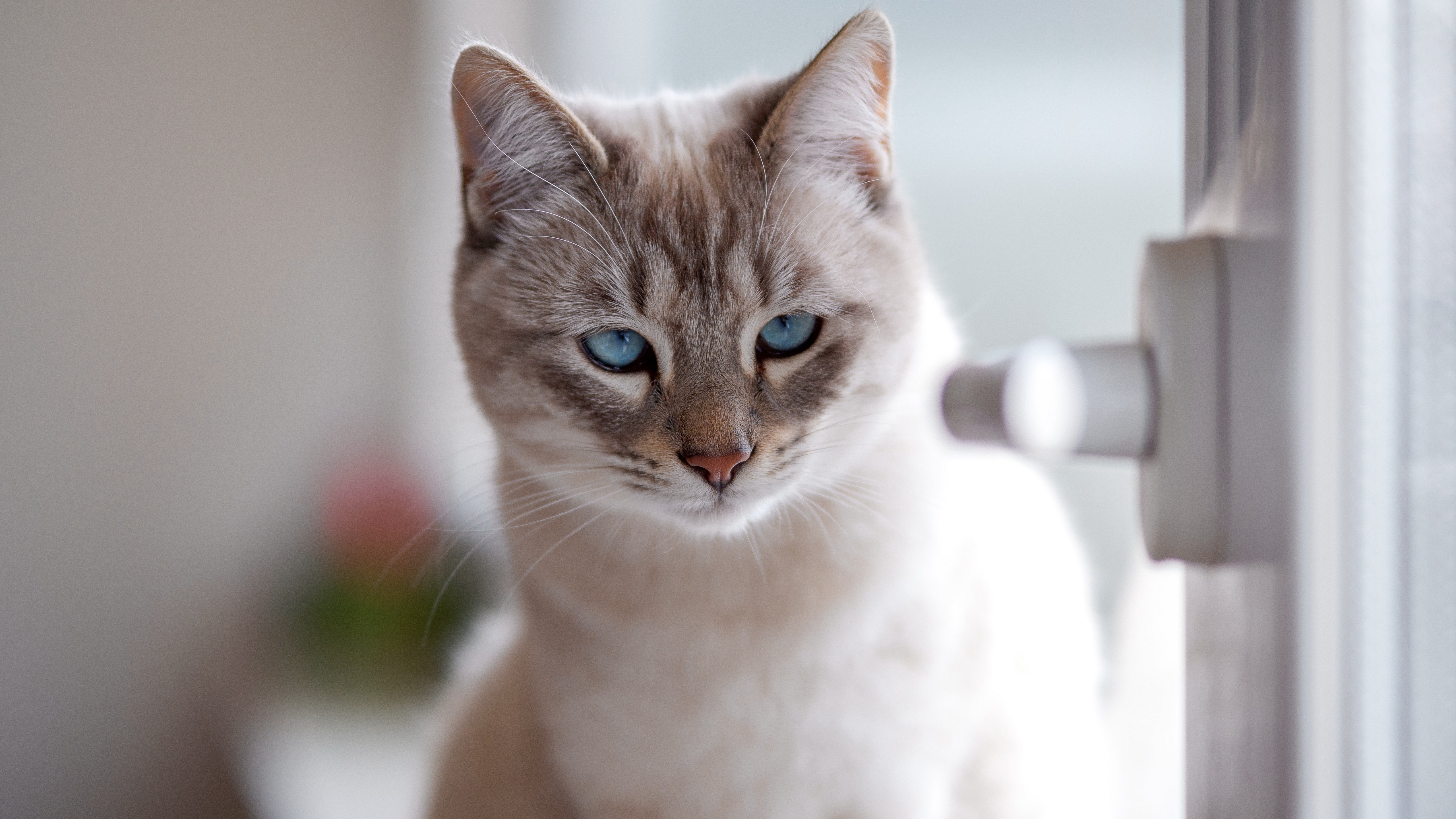 Description: A cat with blue eyes looking out a window with a handle on it's door handle and a plant in the background.