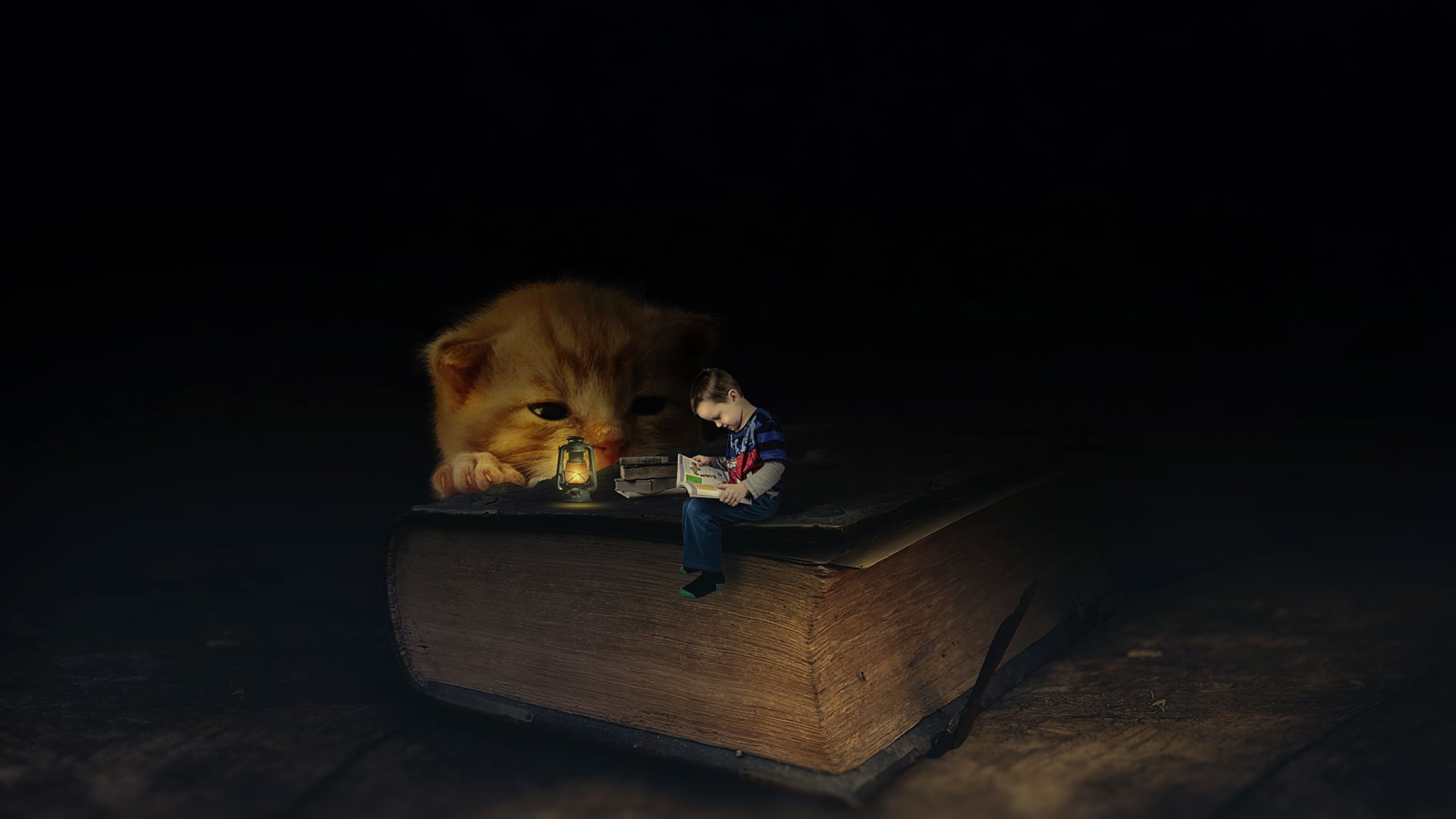 Description: A cat sitting on top of a book with a toy figure on top of it and a toy mouse on top of it.