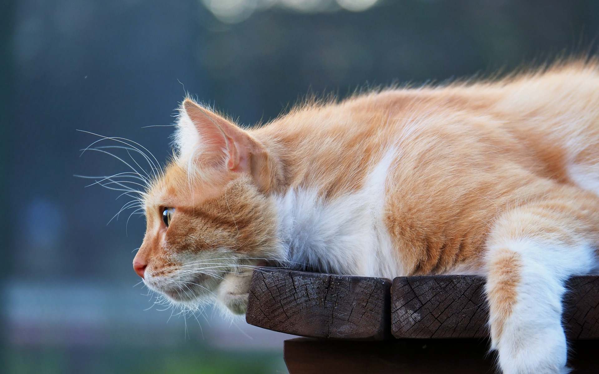 Description: A cat laying on top of a wooden table next to a window sill and a tree in the background.