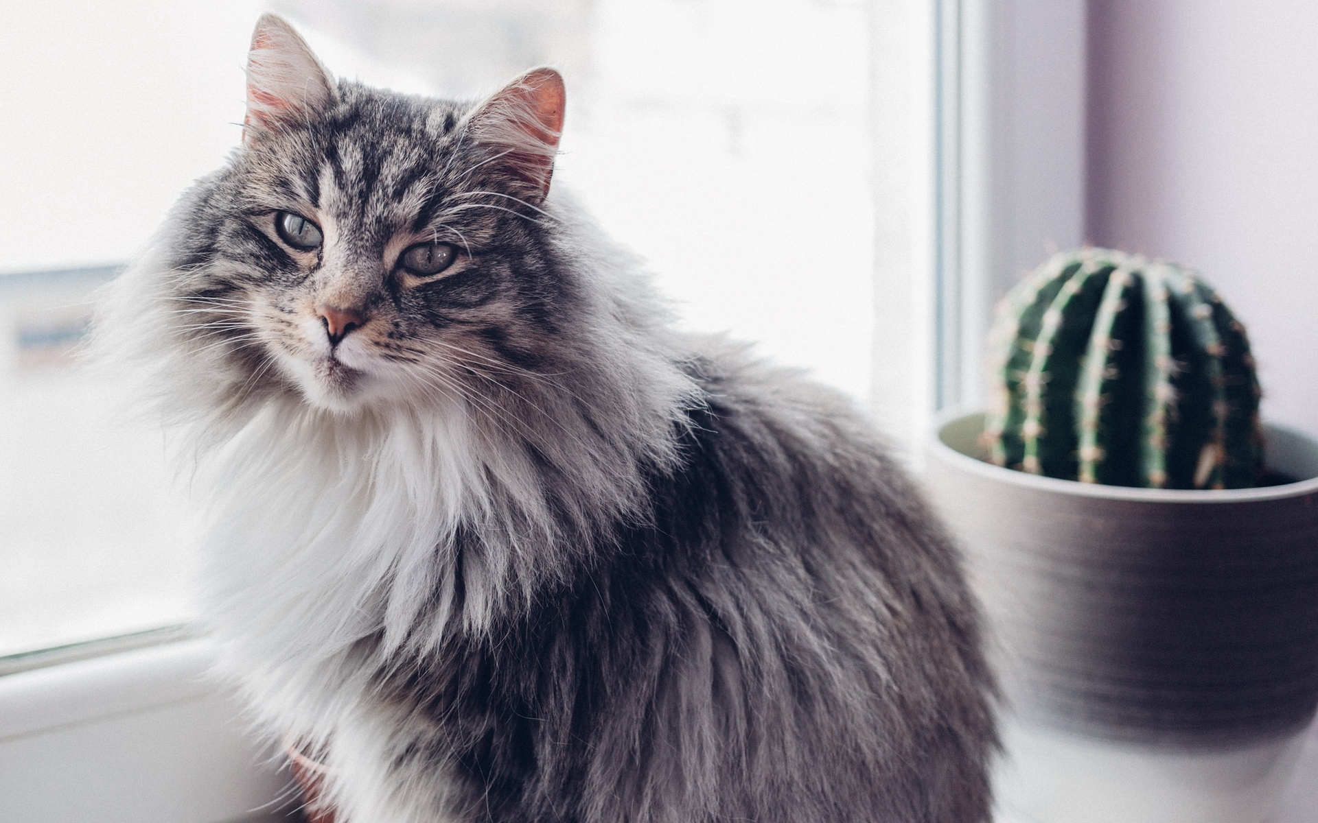 Description: A cat sitting on a window sill next to a cactus in a potted planter and a window.