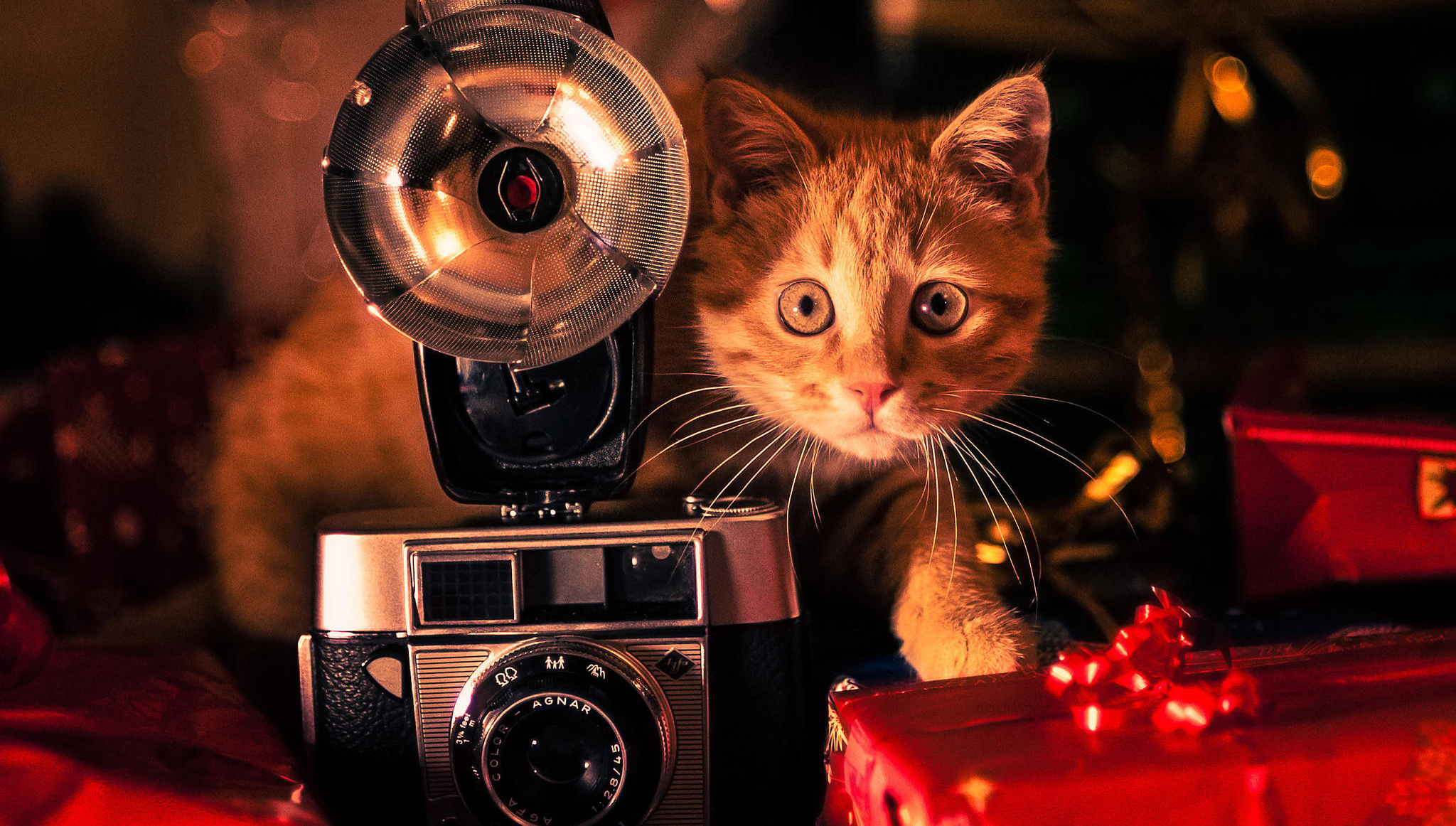 Description: A cat is looking at a camera and a box with a bow on it and a camera on the ground.