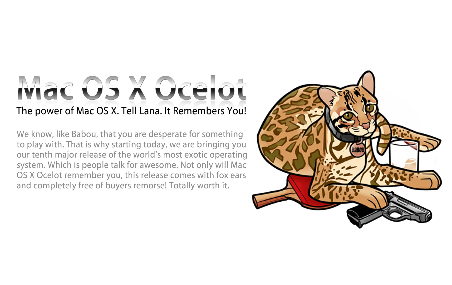 Description: A cat sitting on a chair with a glass of water in its paws and a caption that reads mac os x octut.